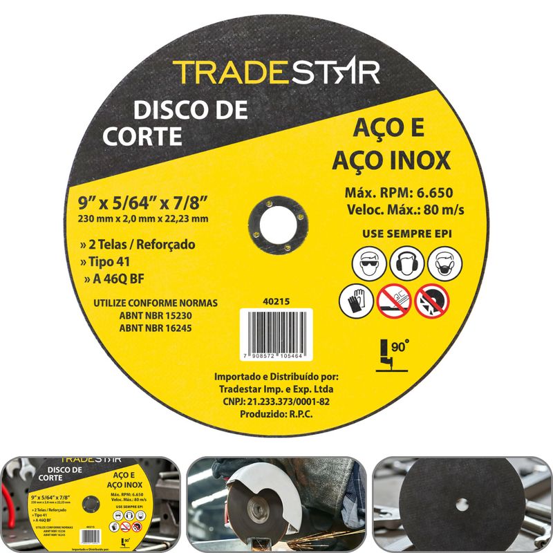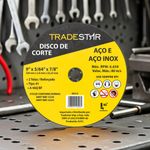 Disco de Corte Tradestar 230 x 2,0 mm Furo 7/8" Aço e InoxO Disco de Corte Tradestar 230 x 2,0 mm Furo 7/8" Aço e Inox é um acessório indispensável para profissionais que exigem cortes rápidos, precisos e com excelente acabamento. Fabricado em óxido de alumínio aglomerado com resina, este disco abrasivo foi desenvolvido para oferecer alto desempenho e maior durabilidade, mesmo em trabalhos intensivos. O Disco Tradestar é ideal para ser utilizado em esmerilhadeiras angulares, proporcionando cortes limpos e ágeis, sem rebarbas excessivas. A sua estrutura reforçada com duas telas de fibra de vidro garante maior resistência mecânica, oferecendo segurança e estabilidade durante o uso em altas rotações.Esse disco é indicado para o corte de aço carbono, aço inoxidável e metais não ferrosos, sendo amplamente utilizado em serralherias, metalúrgicas, oficinas mecânicas, construção civil e manutenção industrial. A espessura reduzida de 1,0 mm permite cortes mais finos, com menor esforço da máquina e menor geração de calor, o que contribui para preservar tanto a peça trabalhada quanto a vida útil do disco.O Disco de Corte Tradestar 230 x 2,0 mm alia eficiência, durabilidade e segurança, oferecendo excelente custo-benefício para profissionais e empresas que buscam qualidade superior em seus trabalhos. É uma solução prática e confiável para quem precisa de cortes rápidos e precisos em aço e inox.Especificações- Diâmetro externo: 230 mm- Espessura: 2 mm- Furo central: 22,23 mm (7/8")- Material: Óxido de alumínio aglomerado com resina- Reforço: 2 telas de fibra de vidro- Aplicações: Corte de aço, inox e metais não ferrosos- Segmento: Metalurgia / Construção Civil / Manutenção IndustrialItens inclusos- 1 Disco de Corte 230 x 2,0 mm Furo 22,23 mm Aço e InoxGarantia- 03 meses com o Fabricante