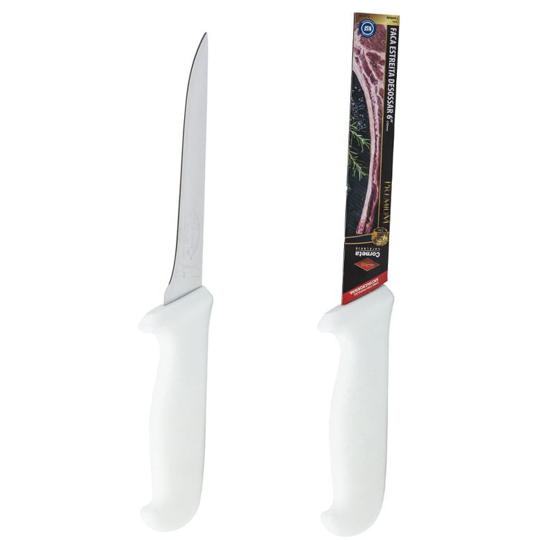 FACA ESTREITA DESOSSAR 6 BRANCA - Dimensões da Peça: 28,8 x 4,7 x 2,6 cm - Dimensões da Embalagem: 29,5 x 3,5 x 2,4cm - Quantidade Inner: 10 Peças - Dimensões Inner: 30 x 9 x 9 cm - Quantidade Master: 40 Peças - Dimensões Master: 32 x 19,5 x 19 cm - Material: Aço inox e PP - Cor: Cabo Branco - Tipo de Embalagem: Bainha - Marca: Corneta Cutelaria - Origem: China - Espessura: 0,25cm - Indicação - Indicado para retirar ossos, gorduras ou cartilagens das carnes - Características - Lâmina de 2,5mm de espessura estampada de aço inoxidável recebendo tratamento térmico total - Cabo injetado em polipropileno - Atenção - Cuidado ao manusear produtos cortantes e perfurantes - Guarde em local seguro - Guarde estas instruções para futuras consultas - Manter fora do alcance das crianças Garantia do produto: 90 dias de garantia de acordo com o Código de Defesa do Consumidor + a Garantia do Fabricante