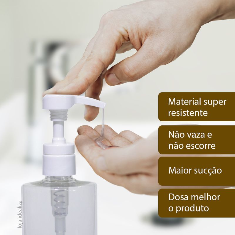 VANTAGENS- Material resistente- Válvula Pump Profissional- Maior sucção e melhor dosagem do produto- Não vaza e não escorre o líquido- Facilita a organização e uso dos produtos- Proporciona mais higiene durante o uso IDEAL PARA DIVERSOS USOS- Detergente;- Álcool em gel;- Sabonete/Sabão líquido;- Cremes;- Shampoo;- Condicionador; CAPACIDADE: 500ml DIMENSÕES: 22cm x 6,9cm (com a válvula aberta) MATERIAL: 100% PVC | PET | Plástico CONTÉM:- 10 Frasco(S) Pet de 500ml (incolor/transparente)- 10 Válvula(s) Pump Profissional (branca) Somos fabricantes, por isso garantimos o melhor preço e qualidade para esse produto.Um produto Idealiza Comércio de Utilidades.