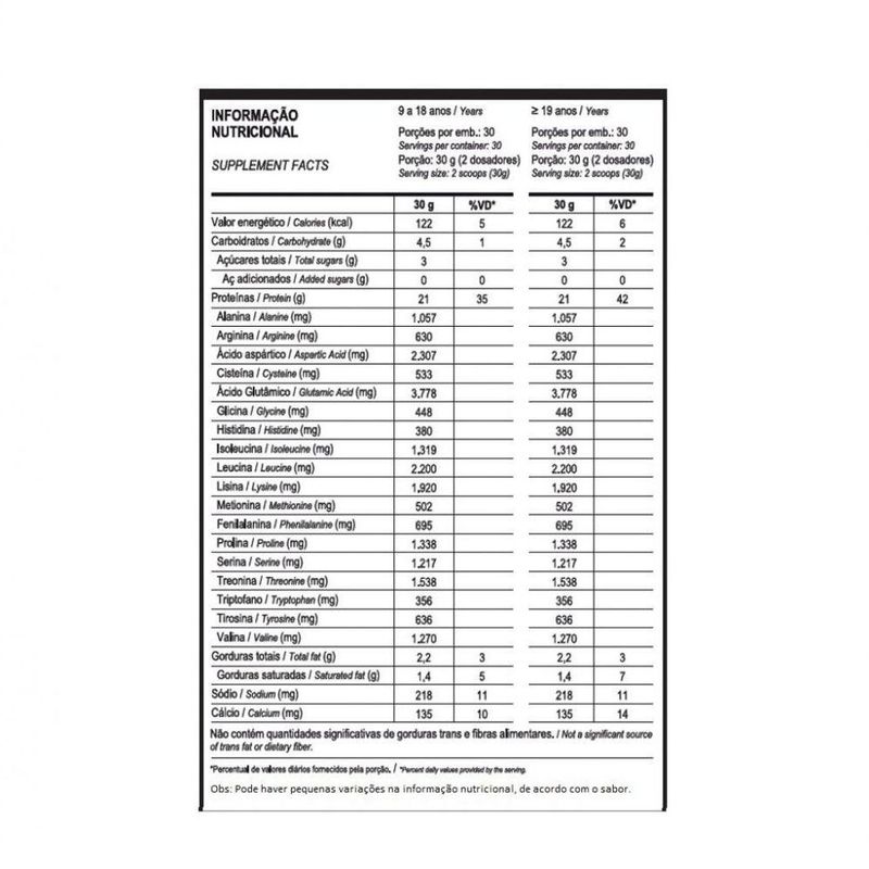 100% Pure Whey Refil (900g) - Sabor: Baunilha100% Pure Whey Refil (900g) 100% Pure Whey é o suplemento proteico campeão de vendas Probiótica, composto basicamente por proteína concentrada do soro do leite (whey protein concentrate), matéria-prima elaborada com alta tecnologia e com elevada concentração de aminoácidos. De preparo instantâneo, 100% PURE WHEY é indicado para ser tomado antes e/ou após os exercícios. Adquira já o 100% Pure Whey Probiótica e experimente a qualidade e eficácia de um suplemento desenvolvido especialmente para atletas e praticantes de atividade física. Com sua fórmula 100% pura e com delicioso sabor, este suplemento será seu grande aliado para conquistar um corpo mais saudável e definido. Benefícios: - 21 a 24g de proteínas por porção;- Alto teor de proteínas;- 5.694mg de BCAA, por porção;- Auxilia na formação dos músculos e ossos. Informação Nutricional100% Pure Whey Refil (900g) - Probiótica - Sabor iogurte com cocoporções por embalagem: cerca de 23Porção de 40g (2 dosadores) Quantidade por porção9 a 18 anos %VD*40gAdultos %VD*Valor Energético153kcal6155kcal8Carboidratos8,3g29g3Açúcares totais5,7g 5,7g Açúcares adicionados0,4g10,4g1Proteínas24g4024g48Alanina1.254mg 1.257mg Arginina747mg 749mg Ác. Aspartico2.736mg 2.743mg Cisteína630mg 633mg Ác. Glutâmico4.476mg 4.489mg Glicina532mg 533mg Histidina453mg 453mg Isoleucina1.562mg 1.567mg Leucina2.608mg 2.615mg Lisina2.274mg 2.281mg Metionina595mg 596mg Fenilalanina825mg 827mg Prolina1.558mg 1.590mg Serina1.447mg 1.447 Treonina1.816mg 1.824 Triptofano422mg 423 Tirosina753mg 755mg Valina1.510mg 1.512mg Gorduras totais2,6g32,6g4Gorduras saturadas1,7g61,7g9Sódio212mg18357mg18Cálcio264mg12357mg16Não contém quantidades significativas de gorduras trans e fibras alimentares. * Porcentual de valores diários fornecidos pela porção. Obs: Pode haver pequenas variações na informação nutricional, de acordo com o sabor. Informação Nutricional100% Pure Whey Refil (900g) - Probiótica - BaunilhaPorção de 30g (2 dosadores) Quantidade por porção9 a 18 anos %VD*Adultos %VD*Valor Energético119kcal = 500kj68Carboidratos5,1g23Proteínas21g6248Gorduras totais2,1g44Gorduras saturadas1,3g69Gorduras trans0g--Fibra alimentar0g00Sódio53mg22Cálcio146mg2115Não contém quantidades significativas de gorduras trans e fibras alimentares. * Porcentual de valores diários fornecidos pela porção. Obs: Pode haver pequenas variações na informação nutricional, de acordo com o sabor. Informação Nutricional100% Pure Whey Refil (900g) - Probiótica - Morangoporções por embalagem: 30Porção de 30g (2 dosadores) Quantidade por porção9 a 18 anos %VD*40gAdultos %VD*Valor Energético123kcal6155kcal8Carboidratos5g29g3Açúcares totais3,6g 5,7g Açúcares adicionados0g10,4g1Proteínas21g4024g48Alanina1.074mg 1.257mg Arginina640mg 749mg Ác. Aspartico2.343mg 2.743mg Cisteína630mg 633mg Ác. Glutâmico4.476mg 4.489mg Glicina532mg 533mg Histidina453mg 453mg Isoleucina1.562mg 1.567mg Leucina2.608mg 2.615mg Lisina2.274mg 2.281mg Metionina595mg 596mg Fenilalanina825mg 827mg Prolina1.558mg 1.590mg Serina1.447mg 1.447 Treonina1.816mg 1.824 Triptofano422mg 423 Tirosina753mg 755mg Valina1.510mg 1.512mg Gorduras totais2,6g32,6g4Gorduras saturadas1,7g61,7g9Sódio219mg18357mg18Cálcio144mg12357mg16Não contém quantidades significativas de gorduras trans e fibras alimentares. * Porcentual de valores diários fornecidos pela porção. Obs: Pode haver pequenas variações na informação nutricional, de acordo com o sabor. Informação Nutricional100% Pure Whey Refil (900g) - Probiótica - Cookiesporções por embalagem: cerca de 23Porção de 40g (2 dosadores) Quantidade por porção9 a 18 anos %VD*40gAdultos %VD*Valor Energético159kcal6155kcal8Carboidratos9,1g29g3Açúcares totais5,5g 5,7g Açúcares adicionados0,6g10,4g1Proteínas24g4024g48Alanina1.268mg 1.257mg Arginina755mg 749mg Ác. Aspartico2.766mg 2.743mg Cisteína630mg 633mg Ác. Glutâmico4.476mg 4.489mg Glicina532mg 533mg Histidina453mg 453mg Isoleucina1.562mg 1.567mg Leucina2.608mg 2.615mg Lisina2.274mg 2.281mg Metionina595mg 596mg Fenilalanina825mg 827mg Prolina1.558mg 1.590mg Serina1.447mg 1.447 Treonina1.816mg 1.824 Triptofano422mg 423 Tirosina753mg 755mg Valina1.510mg 1.512mg Gorduras totais2,6g32,6g4Gorduras saturadas1,7g61,7g9Sódio334mg18357mg18Cálcio171mg12357mg16Não contém quantidades significativas de gorduras trans e fibras alimentares. * Porcentual de valores diários fornecidos pela porção. Obs: Pode haver pequenas variações na informação nutricional, de acordo com o sabor.