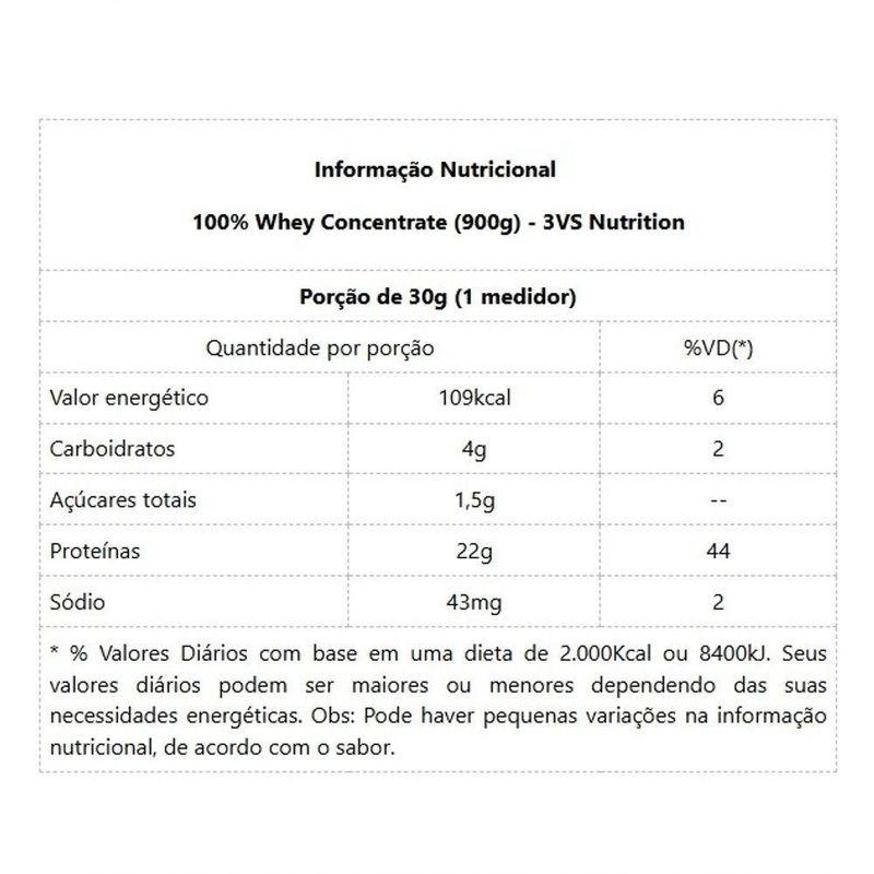 100% Whey Concentrate (900g) - Sabor: Natural100% Whey Concentrate (900g) 100% Whey da 3VS Nutrition é um suplemento feito exclusivamente com a proteína concentrada do soro do leite (WPC 80), sem a adição de proteínas com valores biológicos menores, dessa forma podemos chamar de 100% WPC 80. É o suplemento proteico ideal para praticantes de qualquer atividade física que busca ganho de massa magra ou recuperação muscular ou ainda para quem está em uma dieta alimentar saudável controlando peso e buscando elevar a ingestão proteica. Pode ser consumido a qualquer hora do dia pré/pós-treino, ao acordar, entre refeições ou conforme orientação de seu nutricionista. Benefícios: - Até 24g de proteínas, por porção;- Zero Adição de Açúcar;- Serve até 30 doses;- Baixo Teor de Carboidratos e Gorduras;- Manutenção da Massa Muscular;- Rápida Absorção e Recuperação Pós Treino;- Auxilia na Definição Muscular.Informação Nutricional 100% Whey Concentrate (900g) - 3VS Nutrition - Sabor NaturalPorção de 30g (1 medidor)Quantidade por porção%VD(*)Valor energético111kcal6Carboidratos3g1Açúcares totais1,2g--Proteínas24g48Sódio44mg2* % Valores Diários com base em uma dieta de 2.000Kcal ou 8400kJ. Seus valores diários podem ser maiores ou menores dependendo das suas necessidades energéticas. Obs: Pode haver pequenas variações na informação nutricional, de acordo com o sabor. Informação Nutricional 100% Whey Concentrate (900g) - 3VS Nutrition - Sabor CookiesPorção de 30g (1 medidor)Quantidade por porção%VD(*)Valor energético109kcal6Carboidratos4g2Açúcares totais1,5g--Proteínas22g44Sódio43mg2* % Valores Diários com base em uma dieta de 2.000Kcal ou 8400kJ. Seus valores diários podem ser maiores ou menores dependendo das suas necessidades energéticas. Obs: Pode haver pequenas variações na informação nutricional, de acordo com o sabor. Informação Nutricional 100% Whey Concentrate (900g) - 3VS Nutrition - Sabor PistachePorção de 30g (1 medidor)Quantidade por porção%VD(*)Valor energético107kcal6Carboidratos3,6g2Açúcares totais1,2g--Proteínas23g48Sódio43mg2* % Valores Diários com base em uma dieta de 2.000Kcal ou 8400kJ. Seus valores diários podem ser maiores ou menores dependendo das suas necessidades energéticas. Obs: Pode haver pequenas variações na informação nutricional, de acordo com o sabor. INFORMAÇÃO NUTRICIONALPorções por embalagem: 30Porção: 30 g (1 medidor)Sabor ChocolateQuantidade por porção30 g%VD*Valor energético (kcal)1055%Carboidratos (g)3,31%Açúcares totais (g)1,2—Proteínas (g)2244%Gorduras totais (g)1,52%Gorduras saturadas (g)0,84%Sódio (mg)442%*Não contém quantidades significativas de açúcares adicionados, gorduras trans e fibras alimentares.*Percentual de valores diários fornecidos pela porção .AminoácidoQuantidade (g)Proteínas79,0Ácido Aspártico8,77Ácido Glutâmico14,38Alanina4,02Arginina2,04Cisteína2,04Fenilalanina2,54Glicina1,76Histidina1,37Isoleucina5,02Leucina10,36Lisina7,31Metionina1,93Prolina5,09Serina4,02Tirosina2,87Treonina5,08Triptofano1,53Valina4,81 Informação Nutricional 100% Whey Concentrate (900g) - 3VS Nutrition - Sabor BaunilhaPorção de 30g (1 medidor)Quantidade por porção%VD(*)Valor energético109kcal6Carboidratos4,1g2Açúcares totais1,2g--Proteínas23g48Sódio42mg2* % Valores Diários com base em uma dieta de 2.000Kcal ou 8400kJ. Seus valores diários podem ser maiores ou menores dependendo das suas necessidades energéticas. Obs: Pode haver pequenas variações na informação nutricional, de acordo com o sabor. Informação Nutricional 100% Whey Concentrate (900g) - 3VS Nutrition - Sabor MorangoPorção de 30g (1 medidor)Quantidade por porção%VD(*)Valor energético106kcal5Carboidratos3,8g Açúcares totais1,2g--Proteínas22g48Sódio42mg2* % Valores Diários com base em uma dieta de 2.000Kcal ou 8400kJ. Seus valores diários podem ser maiores ou menores dependendo das suas necessidades energéticas. Obs: Pode haver pequenas variações na informação nutricional, de acordo com o sabor.