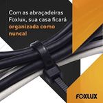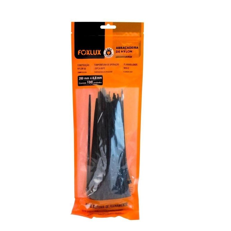 100 Un Abraçadeira De Nylon Foxlux Preto 200x2,5mmIndicadas para fixação e organização de cabos, estas abraçadeiras oferecem alta resistência e praticidade em diversas aplicações. Produzidas em nylon, proporcionam fechamento firme e seguro, sendo ideais para instalações elétricas, organização de fios e uso em ambientes domésticos ou profissionais. A cor preta proporciona discrição, enquanto a embalagem com 100 unidades assegura ótimo rendimento.Ficha Técnica:– Material: Nylon– Cor: Preto– Dimensões: 200 x 4,8 mm– Tipo: Abraçadeira de fixação– Quantidade: 100 unidades– Aplicação: Fixação elétrica e organização de cabosComo Utilizar:Envolva os cabos ou objetos com a abraçadeira, insira a ponta no fecho até formar o laço desejado e puxe até que fique firme. Para finalizar, corte o excesso e mantenha a fixação discreta e segura.Diferenciais:– Alta resistência para diferentes tipos de aplicação– Fixação prática e rápida sem necessidade de ferramentas– Cor preta que proporciona discrição na instalação– Estrutura em nylon que assegura firmeza e durabilidade– Embalagem com 100 unidades que proporciona ótimo rendimentoPerguntas Frequentes (FAQ):P: As abraçadeiras podem ser reutilizadas?R: Não, são de uso único.P: Podem ser usadas em áreas externas?R: Sim, desde que não haja exposição prolongada ao sol e intempéries.P: São adequadas para cabos grossos?R: Sim, este modelo suporta fixação de cabos médios e grossos.Sobre a Marca:Há mais de 20 anos, a Foxlux fornece produtos para a construção e manutenção de ambientes residenciais e de trabalho. Presente em todo o Brasil, a marca atua nos segmentos de Iluminação, Ferramentas, Materiais Elétricos e Utilidades, oferecendo um amplo e completo portfólio de produtos reconhecidos no mercado pela segurança e qualidade.