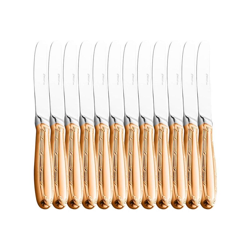 12 Facas Wolff Croisé de Aço Inox para Mesa Rose Contém: 12 FacasLava Louça: NãoMicroondas: NãoForno: NãoFogão: NãoFreezer: NãoMedidas Produto: Altura 1,50cm x Largura 2,50cm x Comprimento 24,00cmPeso: 0,10KgCor: RoseMaterial: Aço InoxLavar com detergente neutro, esponja macia e secar imediatamente. Não utilizar outros produtos químicos.