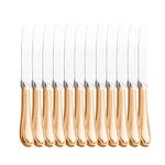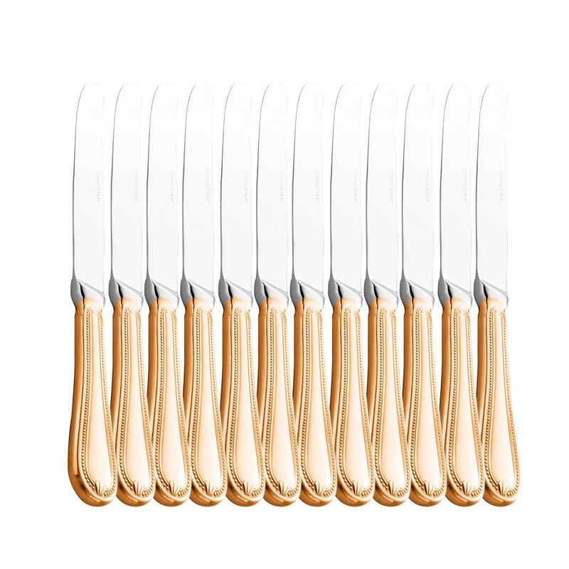 12 Facas Wolff Geneve de Aço Inox para Mesa Rose Contém: 12 FacasLava Louça: NãoMicroondas: NãoForno: NãoFogão: NãoFreezer: NãoMedidas Produto: Altura 2,50cm x Largura 1,20cm x Comprimento 23,70cmPeso: 1,20KgCor: RoseMaterial: Aço InoxLavar com detergente neutro, esponja macia e secar imediatamente. Não utilizar outros produtos químicos.