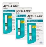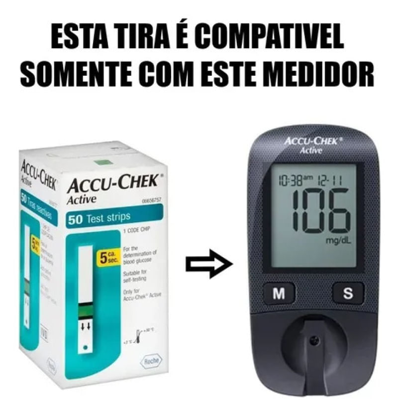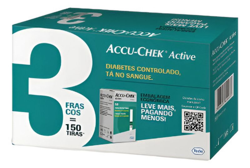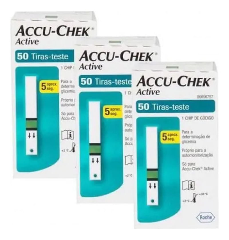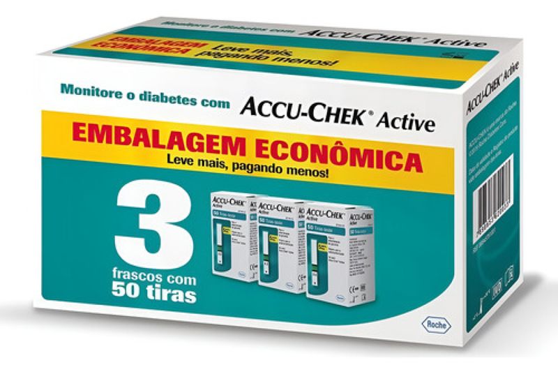 Este conjunto de 150 tiras Accu-Chek Active é ideal para o controle eficiente e preciso da glicemia. Cada caixa contém 50 tiras, adequadas para automonitorização e exclusivas para a linha Active da marca Accu-Chek. As tiras Accu-Chek Active identificam se a amostra de sangue foi insuficiente e permitem a colocação de uma segunda gota em até 10 segundos. Oferecem mais flexibilidade ao usuário, pois permitem a aplicação da gota de sangue com a tira dentro ou fora do monitor de glicemia. Caso a primeira gota de sangue inserida seja insuficiente para a leitura da glicemia, você tem a possibilidade de colocar uma 2ª gota de sangue na tira, em até 10 segundos. Modo de usar: deslize cuidadosamente a tira para dentro do monitor, no sentido das setas. Com seu lancetador Accu-Chek Softclix, faça a punção no dedo para obter a gota de sangue. Lembre-se de trocar a lanceta a cada uso para uma punção praticamente indolor. Quando o símbolo da gota de sangue aparecer piscando, aplique a gota de sangue no centro da área verde. Em 5 segundos o resultado aparecerá no visor. Importante: o prazo de validade das tiras está presente no próprio frasco de tiras, e é muito importante que ele seja respeitado. Essa simples medida evita que o resultado dos seus testes de glicemia seja prejudicado.