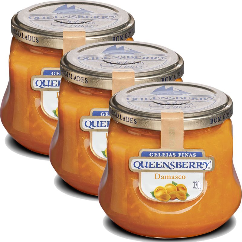 3 Geleias de Damasco Classic 320G - Queensberry A Geleia de Damasco Classic é ideal para um café da manhã gostoso, com o verdadeiro sabor da fruta. Ingredientes 100% naturais; Sem conservantes, corantes e aromatizantes; Elaborada com alto percentual de frutas inteiras e selecionadas; Não contém soja e derivados; Não contém leite e derivados. Ingredientes: Damasco (50%), Açúcar, Suco Concentrado de Limão, Estabilizante Pectina de Fruta. NÃO CONTÉM GLÚTEN. INGREDIENTES NATURAIS. Dica de consumo Use a imaginação e prove com: - Sanduíches com pães variados; - Torradas com manteiga e requeijão; - Acompanhamento para queijos.