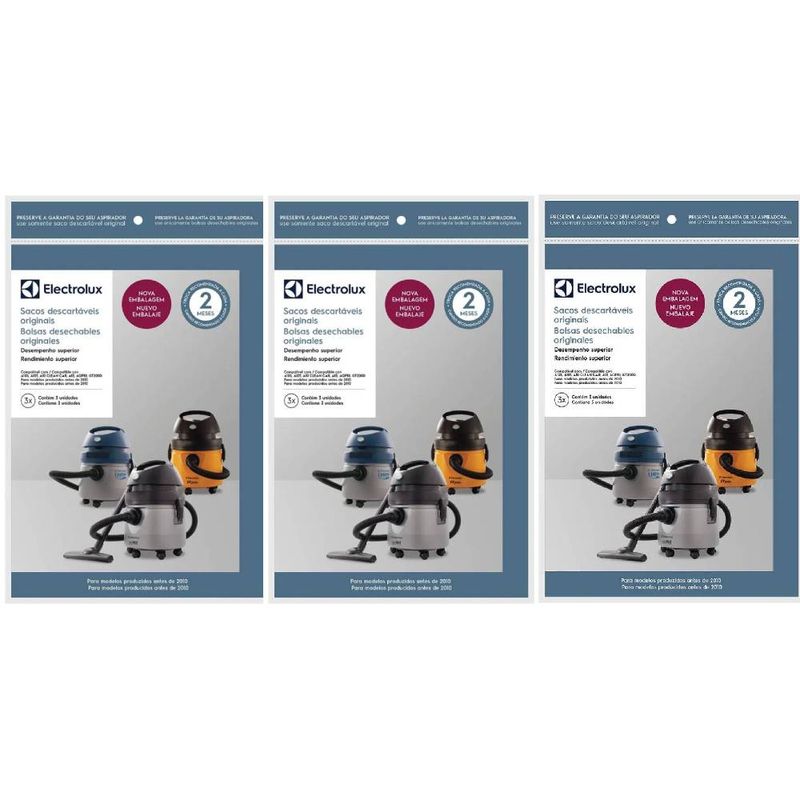 Os sacos descartáveis Electrolux são biodegradáveis e não agridem o ambiente. São higiênicos e desenvolvidos com 2 níveis de filtragem, que evitam que a poeira escape e danifique o motor. Fácil de instalar e de descartar. O único que garante a qualidade Electrolux na sua casa. Atenção: Saco descartável compatível apenas para os modelos de aspirador A10S, A10T, A10 e GT2000 produzidos antes de 2010 (CSE09). - Troca recomendada de cada saco a cada 2 meses, totalizando 6 meses por kit. DIMENSÃO - LARG X PROF X ALT (M) 0,18 x 0,22 x 0,033 COMPOSIÇÃO Papel