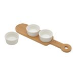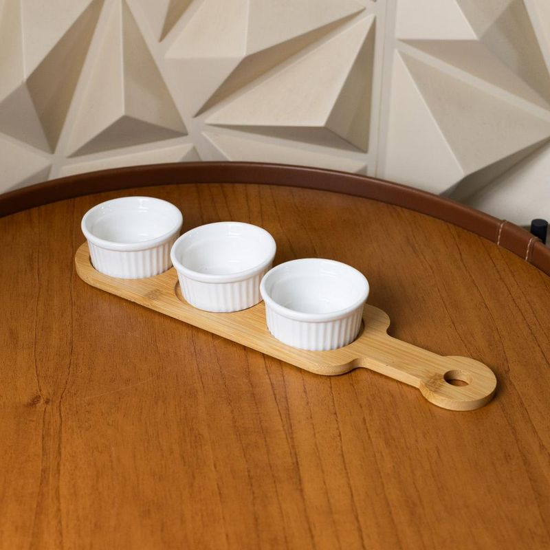 3 Petisqueiras com Bandeja Wolff de Bambu 33cm x 8cm x 4cmApresente seus petiscos com sofisticação e praticidade com o Conjunto de 3 Petisqueiras com Bandeja de Bambu Branco da Wolff. Este conjunto elegante combina a beleza natural do bambu com a funcionalidade de três petisqueiras, proporcionando uma experiência gastronômica memorável.Elegância do Bambu BrancoAs petisqueiras e a bandeja são meticulosamente confeccionadas com bambu branco, destacando sua beleza natural e durabilidade. O bambu adiciona um toque de rusticidade e charme à sua mesa, complementando qualquer decoração.Praticidade e VersatilidadeCom dimensões de 33cm x 8cm x 4cm, a bandeja oferece espaço generoso para as três petisqueiras, tornando-a perfeita para servir uma variedade de petiscos, desde queijos e frutas até aperitivos diversos.Design FuncionalCada petisqueira possui um design prático e elegante, com compartimentos separados para diferentes tipos de petiscos. Isso permite uma apresentação organizada e convidativa dos alimentos, facilitando o serviço e a degustação.Ideal para Diversas OcasiõesSeja para um encontro casual entre amigos ou uma celebração especial, este conjunto é ideal para uma variedade de ocasiões. Sua versatilidade e beleza fazem dele um complemento indispensável para sua mesa.Decoração VersátilAlém de sua funcionalidade, este conjunto acrescenta um toque decorativo à sua mesa. O bambu branco harmoniza facilmente com qualquer estilo de decoração, criando uma atmosfera acolhedora e convidativa em seus eventos.Sirva seus petiscos com elegância e estilo com o Conjunto 3 Petisqueiras com Bandeja de Bambu Branco da Wolff.Wolff. A excelência em receber, servir e decorar!Contém: 3 Petisqueiras1 BandejaLava Louça: SimMicroondas: SimForno: NãoFogão: NãoFreezer: NãoMedidas Produto: Altura 4,00cm x Largura 8,00cm x Comprimento 33,00cmPeso: 0,43KgCor: BrancoMaterial: BambuLavar com detergente neutro, esponja macia e secar imediatamente.
