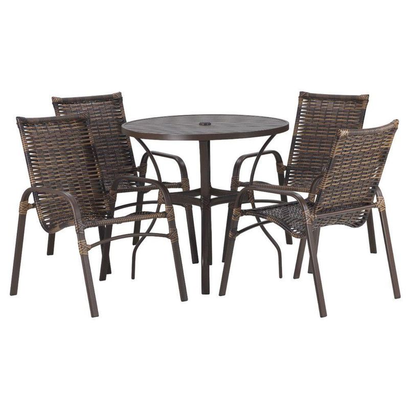 4 Cadeiras Emily E Mesa Roma Com Tampo Ripado Para área ArgilaAo adquirir uma peca TRAMA ORIGINAL, tenha a seguranca em comprar com quem entende do assunto!A empresa e pioneira no ramo de vendas e-commerce de moveis artesanais, ha mais de 15 anos no mercado, focada na qualidade, garante uma excelente experiencia aos seus clientes. Atentos as tendencias, busca sempre a inovacao e variedade dos seus produtos. Ao adquirir qualquer um de nossos moveis, estara adquirindo confianca, credibilidade, conforto e comprometimento, equilibrando qualidade e preco justo! Aguardamos a sua compra, agradecemos a preferencia! Ideal para ambientes Internos, varandas, ediculas, area de lazer, salas de estar, sala de jogos, churrasqueiras, sala de filme, recepcao, sala de espera entre outros. Caracteristicas: Pecas produzidas em aluminio pintado (trabalhamos com a pintura eletrostatica) e revestidas em fibra sintetica com protecao UV. Nossos produtos sao artesanais e podem ocorrer variacoes na medida de ate 2cm. As cores dos produtos podem variar de acordo com o ambiente e com a iluminacao em que as fotos foram tiradas. Aluminio com pintura eletrostatica Itens inclusos: 04 Cadeiras Emily em Aluminio Pintado 01 Mesa Roma Adaptada com tampo ripado Dimensoes Cadeira Emily: Altura total: 84 cm Altura assento ao chao: 39 cm Largura: 55 cm Profundidade: 63cm Suporta ate 160 kg Dimensoes Mesa Roma Adaptada com Tampo Ripado: Altura: 70 cm Diametro: 100 cm Tampo Ripado em Aluminio Garantia do Fabricante: 12 Meses Atencao: consulte o custo de envio. Obs: mantenha os seus dados cadastrais atualizados, como endereco e telefone para contato! Duvidas frequentes: As cores disponiveis? Temos 11 opcoes de cores disponiveis para a fibra sintetica e 2 opcoes de cores para a pintura da estrutura (Preto, marrom). Como escolher a cor do produto? Apos a confirmacao do pagamento ficara disponivel um campo de mensagens entre o vendedor e o comprador, por la sera acertado todos os detalhes referentes as cores do produto escolhido antes de ser encaminhado para a producao. Os produtos podem ficar expostos ao tempo? Sim, por ser em aluminio pintado e a fibra sintetica possuir filtro UV, o produto pode ficar tranquilamente exposto ao tempo sem que o mesmo danifique-o. Caso ainda tenha duvidas, entre em contato conosco pelo campo de perguntas!!