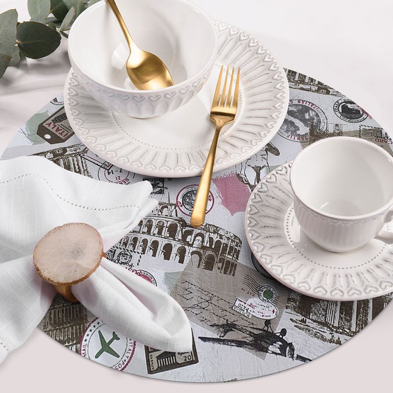 Jogo Americano Redondo Itália Nada como um jogo americano para deixar a sua mesa mais bonita e elegante para a hora da refeição. Feito com material flexível, impermeável, resistente e fácil de limpar. O formato é redondo e possui gravação de itens que remete a Itália , combina com diversos ambientes e situações. Contém 4 peças. DIMENSÕES: Diâmetro: 38cm Altura: 0,1cm Limpe com um pano úmido ou lave com água e sabão neutro. Somos fabricantes, por isso o melhor preço para essa matéria prima. Um produto Idealiza Comercio de Utilidades