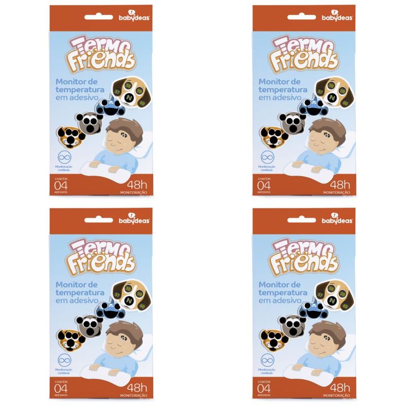 4 TERMO FRIENDS - ADESIVO MEDIDOR DE TEMPERATURA - BABYDEAS Termo Friends oferece praticidade e segurança no monitoramento da temperatura infantil, sem causar qualquer desconforto! Seja na hora do sono, da brincadeira ou até mesmo de ir à escola, basta colar Termo Friends na pele da criança e a mamãe terá até 48 horas de acompanhamento da temperatura. Termo Friends é ideal para que a criança não seja submetida à medição estática. O incrível termômetro adesivo Termo Friends oferece uma maneira prática, fácil e segura de medir e monitorar a temperatura dos pequenos. Com 04 adesivos, eles são de fácil aplicação e hipoalergênicos. Os adesivos em forma de desenhos de bichinhos divertidos são fáceis de aplicar, e ao entrar em contato com o calor do corpo, são capazes de informar em alguns segundos se seu bebê está com a temperatura normal (N) ou com temperaturas de 37, 38, 39 ou 40 graus. Como são hipoalergênicos, eles são seguros e proporcionam um monitoramento contínuo durante 48 horas. Com o Termômetro Adesivo Termo Friends, você não precisa mais acordar seu pequeno durante a noite para verificar sua temperatura. Seja na hora do sono, na hora de brincar ou até mesmo de ir pra escola, os adesivos Termo Friends serão grandes aliados nos cuidados dos bebês e crianças, pois não será necessário passar pelo estressante processo de medição estática. A embalagem contém 4 termômetros adesivos divertidos em forma de bichinhos. Modo de usar: Retire o adesivo da cartela e aplique diretamente sob a pele. Em alguns segundos o Termo Friends ® irá acender indicando a temperatura: N (temperatura normal) ou 37,38,39,40. Características: Uma maneira rápida e segura de monitorar a temperatura; Produto inovador; Tecnologia de cristal líquido encapsulado; Design divertido com desenho de bichinhos; Aplicação rápida, segura e suave; fixa na pele como um adesivo comum; Leitura visível em segundos; Fácil remoção e indolor; Hipoalergênico, para não causar reações alérgicas; Tecnologia de cristal líquido encapsulado; Monitoramento contínuo da temperatura por até 48 horas; Recomenda-se a aplicação na testa, peito ou axilas; Para remover, simplesmente retire da pele e descarte. Não reutilize; Recomendado para crianças maiores de 01 ano; Contem: kit composto por 4 cartelas com 4 adesivos cada.