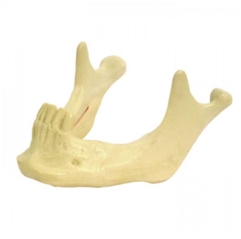 4008 - Mandíbula com Dentes Incisivos e Caninos Desenvolvida em poliuretano rígido, conta com os dentes 33, 32, 31, 41, 42 e 43, simulação do nervo mandibular.Pode ser articulada com todos os modelos de face de nossa linha (sugestão 4014), podendo fazer reabilitação com ou sem altura vertical.