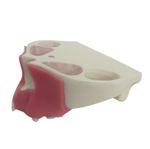 4015 G - Maxilar Com Alguns Dentes + Gengiva Desenvolvida em poliuretano rígido, com membrana emborrachada no seio maxilar e nasal e simulação de gengiva. A face é um corte do crânio, do ouvido para frente e do nariz para baixo, com os seguintes dentes: 11, 12, 14, 18, 24, 26 e 27. Usada em trabalhos e aulas práticas, demonstrações e treinamento de técnicas cirúrgicas.