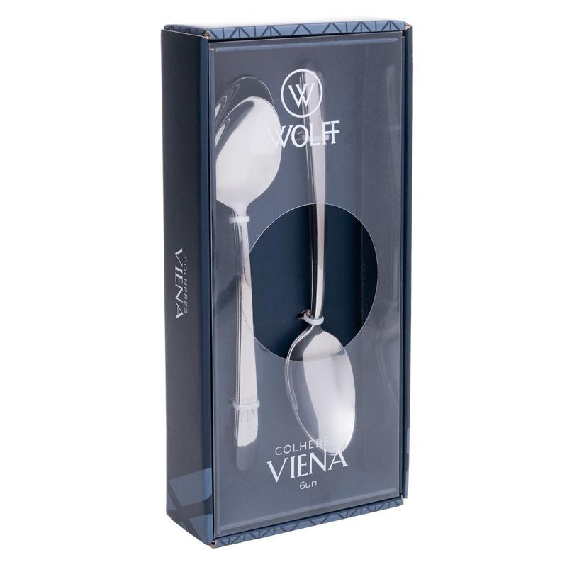 6 Colheres para Mesa Viena Aço Inox WolffBeleza clássica para mesas que impressionam. O conjunto de colheres Viena da Wolff aposta na sobriedade do aço inox para trazer praticidade e sofisticação ao seu dia a dia.Beleza clássica para mesas que impressionam. O conjunto de colheres Viena da Wolff aposta na sobriedade do aço inox para trazer praticidade e sofisticação ao seu dia a dia.• Aço inox de alta qualidadeDurabilidade e brilho contínuo.• Design atemporalElegância que se adapta a qualquer estilo de mesa.• Formato ergonômicoMais conforto no uso diário.• VersatilidadeIdeal para refeições formais e informais.Com Wolff, cada momento à mesa ganha um toque especial de tradição e refinamento.Contém: 6 Colheres para MesaMedidas Produto: Altura 3,00cm x Largura 4,00cm x Comprimento 21,00cmPeso: 0,05KgLavar com detergente neutro, esponja macia e secar imediatamente.