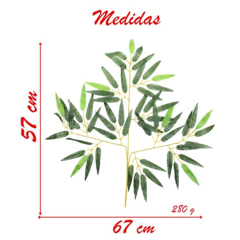72 Ramos Decoração Arranjo Bambu Artificial Planta Decorativa Plástico 12 Galhos Cada 57cm - Ideal para seu ambiente, os arranjos artificiais são modernos, versáteis e exóticos, caem bem em qualquer estilo e lugar, deixando o seu ambiente ainda mais bonito e elegante, devido a seu aspecto natural e realista. As folhas são reutilizáveis e fáceis de limpar, basta limpar a superfície suavemente com um pano úmido. Mantenha fora do alcance de crianças menores de 3 anos de idade. DETALHES: Possui 60 Folhas por ramo Altura: 57cm Cor: Verde. Material: Plástico. Conteúdo da Embalagem: 72 Ramos Folhas de Bambu; Características Gerais do Produto: • Material: Cerâmica • Modelo: 1 Garantia: • Garantia do site - 1 Mês