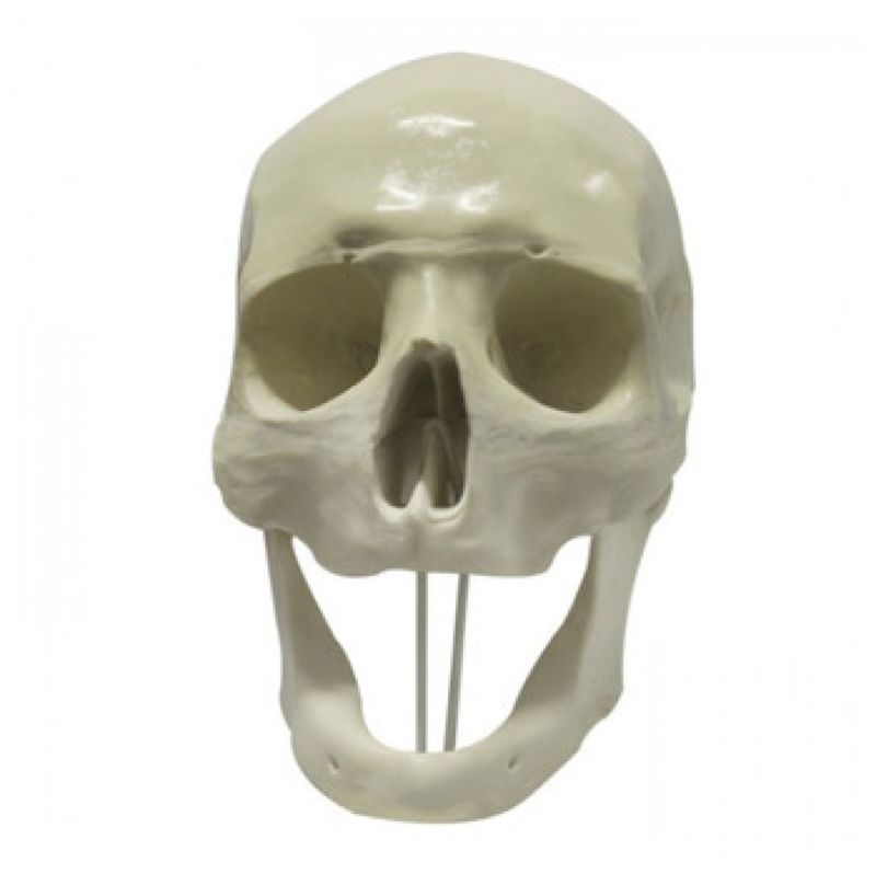 9005 - Crânio Frontal Edêntulo Desenvolvido em poliuretano rígido, usado em workshop e demonstrações. Este produto é muito usado para estudar cortes de ortognática (osteotomia) e colocação de placas de buco-maxilar, colocação de implantes e reabilitação oral, visto que o modelo não possui dentes. A mandíbula é articulada dando uma noção da A.T.M.