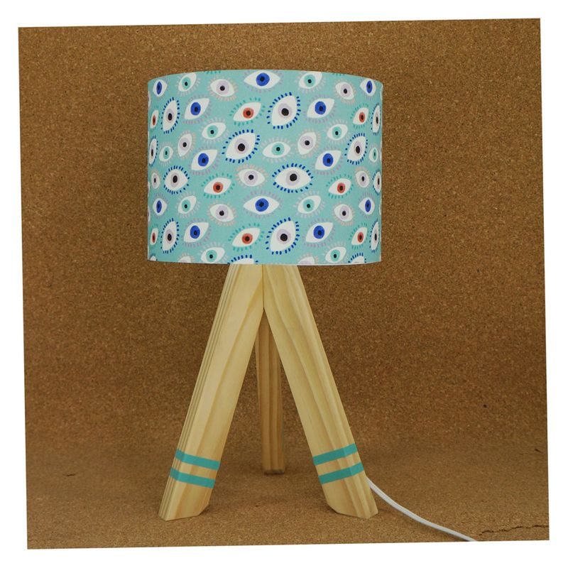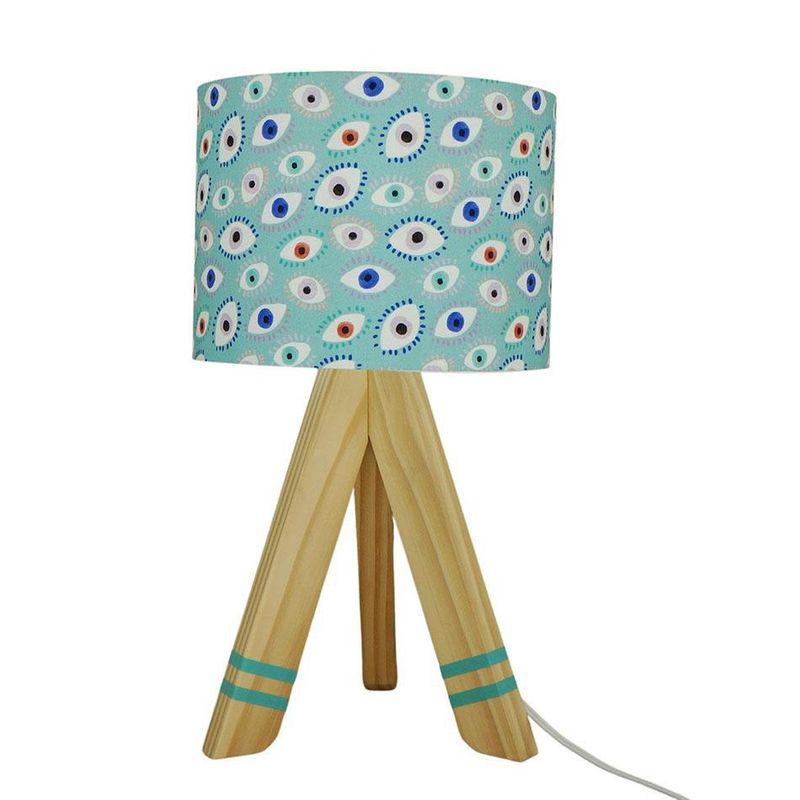 Abajur de mesa com base produzida em madeira pinus. Detalhes em verde nos pés. Cúpula produzida em tecido estampado olho grego. Estampa colorida. Medidas: 37 cm de altura total e 20 cm de largura total. Cúpula medindo 15 cm de altura e 20 cm de largura. Bivolt. Fio branco com plug liga/desliga. Use lâmpadas de led ou fluorescente. Soquete E-27.