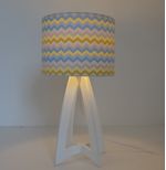 Abajur com base em madeira na cor branca e cúpula revestida com tecido estampado chevron colorido. Cúpula medindo 20 cm de diâmetro x 15 cm de altura. Dimensões do produto: Altura: 35 cm Largura: 20 cm. Bivolt. Usar lâmpadas fluorescentes ou LED Fio branco com plug liga desliga com 1,8m.