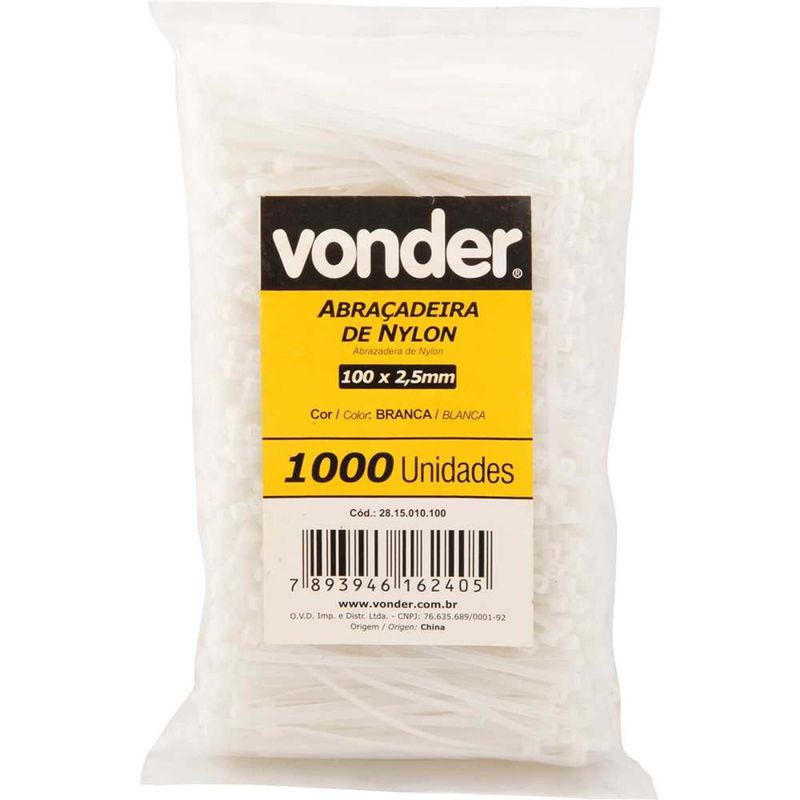 Abraçadeira de Nylon, Branca, 100 mm x 2,5 mm, com 1.000 Peças, Vonder - Conteúdo da embalagem: 1 Pacote com 1.000 abraçadeiras de nylon. Aplicação: Indicada para fixar e organizar fios, cabos, entre outros. Também conhecida no mercado como: enforca gato, fita de nylon e abraçadeira plástica. A abraçadeira VONDER é indicada para uso interno e externo. Destaques: Produzida em nylon 6.6 que proporciona maior resistência à tração. Além de proteção U.V.(resistente à radiação ultravioleta), permitindo o uso em ambientes internos ou externos. Referência: 2815010100 Garantia - E (CDC): Garantia legal: 90 dias Massa aproximada (peso): 0,27 kg Comprimento total (C): 100 mm Largura (L): 2,5 mm Material: Nylon - 6.6 Cor: Branca Diâmetro máximo de amarração (D): 22 mm Temperatura do ambiente de trabalho: -20°C a +80°C Tensão de ruptura: 8 kgf Destaques Comercial: Fabricada em nylon 6.6 resistente à tração e radiação U.V., indicada para uso interno e externo. Aplicação Comercial: Usada para fixar e organizar fios e cabos; também chamada de enforca gato ou abraçadeira plástica VONDER. Características Gerais do Produto: Garantia: • 3 Meses