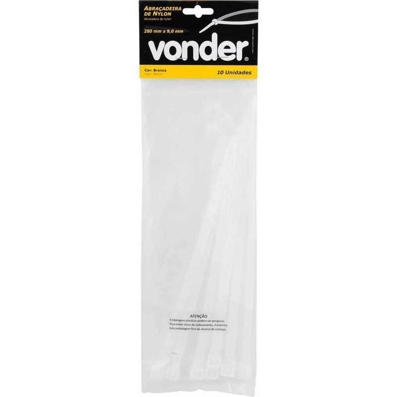 Abraçadeira de Nylon, Branca, 280 mm x 9,0 mm, com 10 Peças, Vonder OstenVonder - Conteúdo da embalagem: 1 Blister com 10 abraçadeiras de nylon. Aplicação: Indicada para fixar e organizar fios, cabos, entre outros. Também conhecida no mercado como: enforca gato, fita de nylon e abraçadeira plástica. A abraçadeira VONDER é indicada para uso interno e externo. Destaques: Produzida em nylon 6.6 que proporciona maior resistência à tração. Além de proteção U.V.(resistente à radiação ultravioleta), permitindo o uso em ambientes internos ou externos. Referência: 2815280009-BRANCA Garantia - E (CDC): Garantia legal: 90 dias Massa aproximada (peso): 0,066 kg Comprimento total (C): 280 mm Largura (L): 9 mm Material: Nylon - 6.6 Cor: Branca Diâmetro máximo de amarração (D): 70 mm Temperatura do ambiente de trabalho: -20°C a +80°C Tensão de ruptura: 79 kgf Destaques Comercial: Produzida em nylon 6.6 com alta resistência e proteção UV, indicada para uso interno e externo. Aplicação Comercial: Usada para fixar e organizar fios e cabos. Conhecida como enforca gato ou abraçadeira plástica, para uso interno e externo. Características Gerais do Produto: Garantia: • 3 Meses