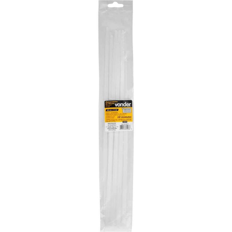 Abraçadeira de Nylon Branca, 400 mm x 7,2 mm com 10 Peças Vonder OstenVonder - Conteúdo da embalagem: 1 Blister com 10 abraçadeiras de nylon. Aplicação: Indicada para fixar e organizar fios, cabos, entre outros. Também conhecida no mercado como: enforca gato, fita de nylon e abraçadeira plástica. A abraçadeira VONDER é indicada para uso interno e externo. Destaques: Produzida em nylon 6.6 que proporciona maior resistência à tração. Além de proteção U.V.(resistente à radiação ultravioleta), permitindo o uso em ambientes internos ou externos. Garantia - E (CDC): Garantia legal: 90 dias Referência: 2815400072 Massa aproximada (peso): 0,04 kg Comprimento total (C): 400 mm Largura (L): 7,2 mm Material: Nylon - 6.6 Cor: Branca Diâmetro máximo de amarração (D): 105 mm Temperatura do ambiente de trabalho: -20 °C a +80 °C Tensão de ruptura: 55 kgf Destaques Comercial: Produzida em nylon 6.6 com alta resistência e proteção UV, adequada para uso interno e externo. Aplicação Comercial: Usada para fixar e organizar fios e cabos; conhecida como enforca gato ou abraçadeira plástica, para uso interno e externo. Características Gerais do Produto: Garantia: • 3 Meses