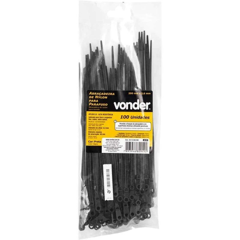 Abraçadeira De Nylon Para Parafusos, Preta, 200 Mm X 3,6 Mm, Vonder OstenvonderAbraçadeira de Nylon Para Parafusos, Preta, 200 mm x 3,6 mm, Vonder OstenVonder -Conteúdo da embalagem: 1 Bolsa plástica com 100 abraçadeiras de nylon.Aplicação: Indicada para fixar e organizar fios, cabos, entre outros. Permite a fixação da abraçadeira em superfícies diversas utilizando parafusos. Também conhecida no mercado como: enforca gato, fita de nylon e abraçadeira plástica.Destaques: Produzida em nylon 6.6 que proporciona maior resistência à tração e proteção U.V. que garante maior vida útil.Referência: 2815200360Garantia - E (CDC): Garantia legal: 90 diasComprimento nominal: 200 mmLargura: 3,6 mmDiâmetro do olhal: 4,3 mmDiâmetro máximo de amarração: 46 mmMassa aproximada (peso): 0,094 kgMaterial: Nylon 6.6Cor: PretaDestaques Comercial: Produzida em nylon 6.6 com alta resistência à tração e proteção U.V. para maior durabilidade.Aplicação Comercial: Indicado para fixar e organizar fios e cabos, com fixação por parafuso em várias superfícies.Características Gerais do Produto:Garantia: - 3 Meses