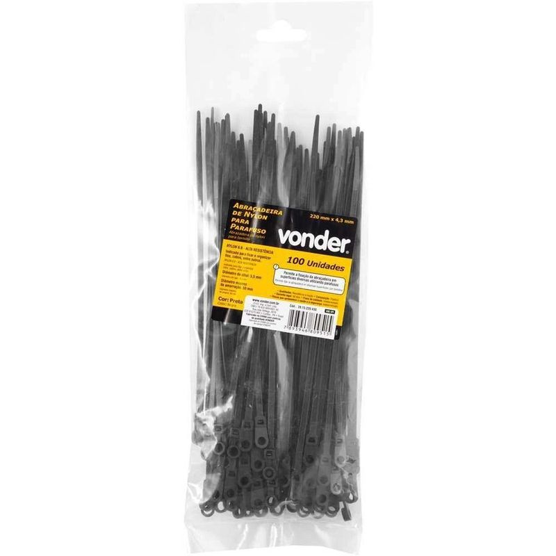 Abraçadeira De Nylon Para Parafusos, Preta, 220 Mm X 4,3 Mm, Vonder OstenvonderAbraçadeira de Nylon Para Parafusos, Preta, 220 mm x 4,3 mm, Vonder OstenVonder -Conteúdo da embalagem: 1 Bolsa plástica com 100 abraçadeiras de nylon.Aplicação: Indicada para fixar e organizar fios, cabos, entre outros. Permite a fixação da abraçadeira em superfícies diversas utilizando parafusos. Também conhecida no mercado como: enforca gato, fita de nylon e abraçadeira plástica.Destaques: Produzida em nylon 6.6 que proporciona maior resistência à tração e proteção U.V. que garante maior vida útil.Referência: 2815220430Garantia - E (CDC): Garantia legal: 90 diasComprimento nominal: 220 mmLargura: 4,3 mmDiâmetro do olhal: 5,5 mmDiâmetro máximo de amarração: 50 mmMassa aproximada (peso): 0,124 kgMaterial: Nylon 6.6Cor: PretaDestaques Comercial: Produzida em nylon 6.6, oferece alta resistência à tração e proteção UV para maior durabilidade.Aplicação Comercial: Usada para fixar e organizar fios e cabos, podendo ser presa com parafusos; conhecida como enforca gato ou abraçadeira plástica.Características Gerais do Produto:Garantia: - 3 Meses