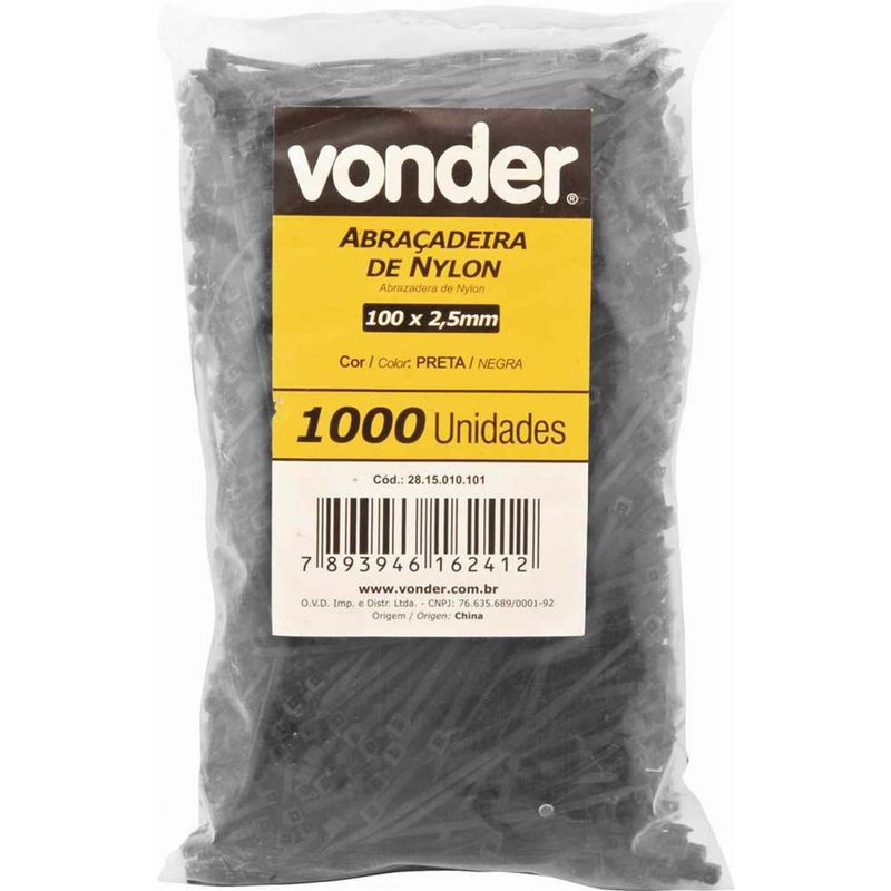 Abraçadeira de Nylon, Preta, 100 mm x 2,5 mm, com 1.000 Peças, Vonder OstenVonder - Conteúdo da embalagem: 1 Pacote com 1.000 abraçadeiras de nylon. Aplicação: Indicada para fixar e organizar fios, cabos, entre outros. Também conhecida no mercado como: enforca gato, fita de nylon e abraçadeira plástica. A abraçadeira VONDER é indicada para uso interno e externo. Destaques: Produzida em nylon 6.6 que proporciona maior resistência à tração. Além de proteção U.V.(resistente à radiação ultravioleta), permitindo o uso em ambientes internos ou externos. Referência: 2815010101 Garantia - E (CDC): Garantia legal: 90 dias Massa aproximada (peso): 0,27 kg Comprimento total (C): 100 mm Largura (L): 2,5 mm Material: Nylon - 6.6 Diâmetro máximo de amarração (D): 22 mm Temperatura do ambiente de trabalho: -20°C a +80°C Tensão de ruptura: 8 kgf Cor: Preta Destaques Comercial: Produzida em nylon 6.6, com alta resistência à tração e proteção U.V. para uso interno e externo. Aplicação Comercial: Indicada para fixar e organizar fios e cabos. Também chamada de enforca gato ou abraçadeira plástica, uso interno e externo. Características Gerais do Produto: Garantia: • 3 Meses