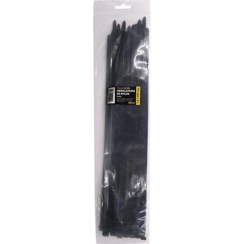Abraçadeira Nylon 4,8 X 300 Mm Preta 100 Unidades TradestarAbraçadeira Plástica Tradestar 4,8 x 300 mm Preta 100 UnidadesA Abraçadeira Plástica Tradestar 4,8 x 300 mm Preta é uma solução prática e eficiente para quem busca organizar, fixar ou agrupar cabos, fios, mangueiras, tubos e diversos outros itens de forma rápida e segura. Ideal para uso residencial, comercial e industrial, esse modelo é fabricado em nylon de alta qualidade, proporcionando resistência e durabilidade, mesmo em condições de uso contínuo.Este modelo é amplamente utilizado em instalações elétricas, montagem de painéis, organização de redes de informática, montagem de equipamentos, jardinagem e até mesmo em projetos de bricolagem. Sua versatilidade faz com que seja indispensável tanto para profissionais quanto para usuários domésticos que buscam uma solução simples, mas altamente funcional para manter tudo no lugar.As abraçadeiras Tradestar são conhecidas por seu acabamento uniforme e resistência mecânica, permitindo que suportem a tração necessária para manter os objetos firmemente presos. Apesar de serem leves e fáceis de manusear, garantem uma fixação estável e , evitando deslocamentos ou solturas indesejadas.O pacote com 100 unidades oferece ótimo custo-benefício, permitindo que você tenha sempre à disposição a quantidade necessária para diferentes projetos e demandas. Seja para uso eventual ou para trabalhos que exigem grande quantidade de fixadores, este conjunto garante praticidade e economia.Especificações- Material: Nylon- Dimensões: 4,8 mm (largura) x 300 mm (comprimento)- Cor: Preta- Sistema de Fechamento: Trava por catraca- Indicação de Uso: Fixação e organização de cabos, fios e objetos diversosItens inclusos- 01 pacote com 100 abraçadeiras plásticas Tradestar 4,8 x 300 mm PretaGarantia- 03 meses com o Fabricante batteries_required:: Não | external_testing_certification:: CE | included_components:: Abraçadeira Nylon 4,8 x 300 mm Preta 100 Unidades Tradestar | manufacturer:: Tradestar | power_source_type:: Manual | required_product_compliance_certificate:: CE | Principais Características do Produto 0 (bullet_point#0): Nylon Resistentes | Principais Características do Produto 1 (bullet_point#1): Cor preta, ideal para organização discreta em instalações elétricas | Principais Características do Produto 2 (bullet_point#2): Pacote com 100 unidades, proporcionando ótimo custo-benefício | unit_count: 1 Pacote