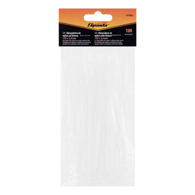 Abraçadeira Plástico 150x3,6mm 100pcs Branco SpartaAbraçadeiras de Plástico Branco Sparta – 100 Unidades para Fixação Segura e OrganizaçãoAs Abraçadeiras de Plástico Branco Sparta 4554855, com dimensões de 150 x 3,6 mm e embaladas em pacotes com 100 unidades, são ferramentas essenciais para quem busca soluções práticas e duráveis para fixação e organização. Ideal para amarração de cabos, fixação de tubos, mangueiras e estruturas, estas abraçadeiras são extremamente versáteis e atendem a uma ampla gama de necessidades. Seja para instalações elétricas e de computadores, reparos, decoração de estandes comerciais, embalagens ou até mesmo para uso doméstico, em casa, na casa de campo ou na garagem, as abraçadeiras Sparta garantem conexões seguras e eficientes. Fabricadas com nylon resistente, oferecem fixações duradouras e suportam tensões significativas. Sua resistência aos raios ultravioleta (UV) e ampla faixa de temperatura de operação (-35 a +85 ?) as tornam adequadas para uso em ambientes externos, mantendo suas propriedades mesmo sob exposição solar direta e em diferentes condições climáticas. Com 100 unidades por pacote, você terá um suprimento generoso para diversos projetos, garantindo organização e estabilidade em todas as suas aplicações. Especificações País de fabricação: China Espessura: 1.1 mm Largura: 3.6 mm Altura na embalagem: 20 mm Comprimento na embalagem: 250 mm Peso bruto: 0.07 kg Largura na embalagem: 100 mm Quantidade por embalagem: 240 unidades Itens Inclusos 100 Abraçadeiras de Plástico Branco Sparta 4554855 Perguntas Frequentes (FAQ) Pergunta: Qual o material das abraçadeiras?Resposta: As abraçadeiras são fabricadas em nylon resistente. Pergunta: As abraçadeiras são resistentes ao sol?Resposta: Sim, são resistentes aos raios ultravioleta (UV). Pergunta: Qual a faixa de temperatura de operação?Resposta: A faixa de temperatura de operação é de -35 a +85 ?. Pergunta: Qual a garantia do produto?Resposta: Garantia legal: 90 dias. Produto: Abraçadeira | Tipo de Produto: Abraçadeira