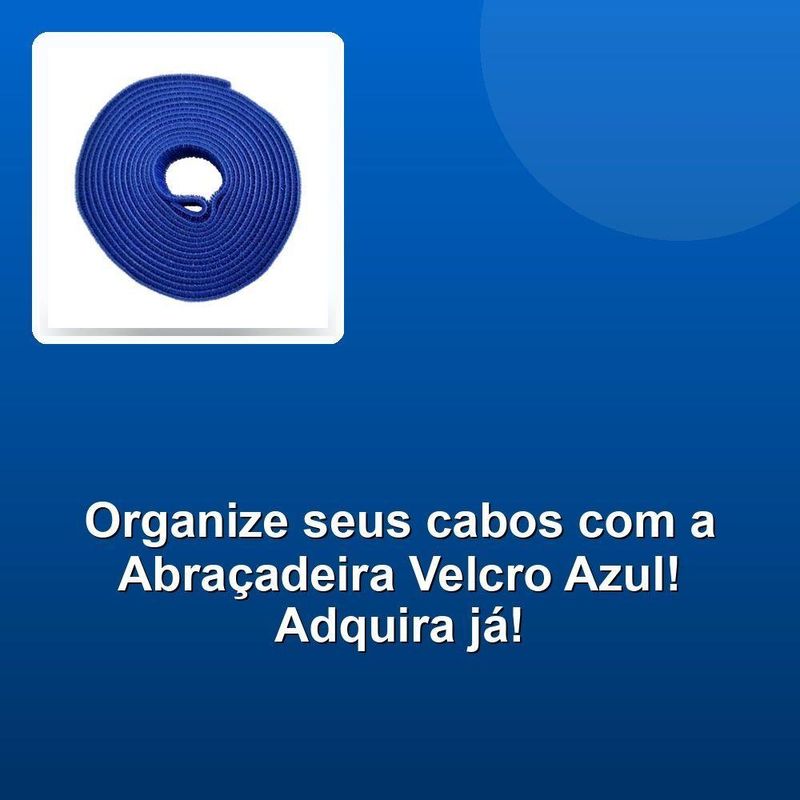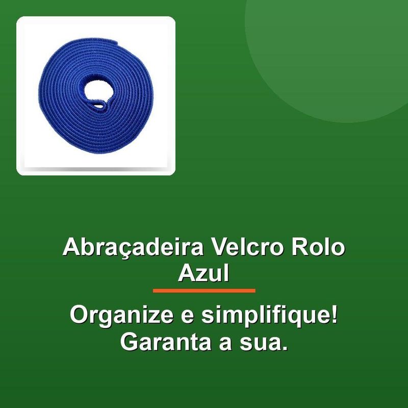 Abraçadeira Velcro Rolo Com 3 Metros Azul Muvc0005Descubra a praticidade e eficiência da Abraçadeira Velcro Rolo Azul Muvc0005. Com 3 metros de comprimento e 20mm de largura, este organizador de cabos dupla face é a solução ideal para manter seus fios e cabos de computadores sempre organizados. Sua cor azul vibrante facilita a identificação e traz um toque de modernidade ao ambiente. Perfeita para amarração e organização de chicotes elétricos, esta abraçadeira oferece flexibilidade e segurança, garantindo que seus cabos fiquem firmemente no lugar. Transforme a desordem em organização com um produto que combina funcionalidade e estilo.Descubra a praticidade e eficiência da Abraçadeira Velcro Rolo Azul Muvc0005. Com 3 metros de comprimento e 20mm de largura, este organizador de cabos dupla face é a solução ideal para manter seus fios e cabos de computadores sempre organizados. Sua cor azul vibrante facilita a identificação e traz um toque de modernidade ao ambiente. Perfeita para amarração e organização de chicotes elétricos, esta abraçadeira oferece flexibilidade e segurança, garantindo que seus cabos fiquem firmemente no lugar. Transforme a desordem em organização com um produto que combina funcionalidade e estilo.