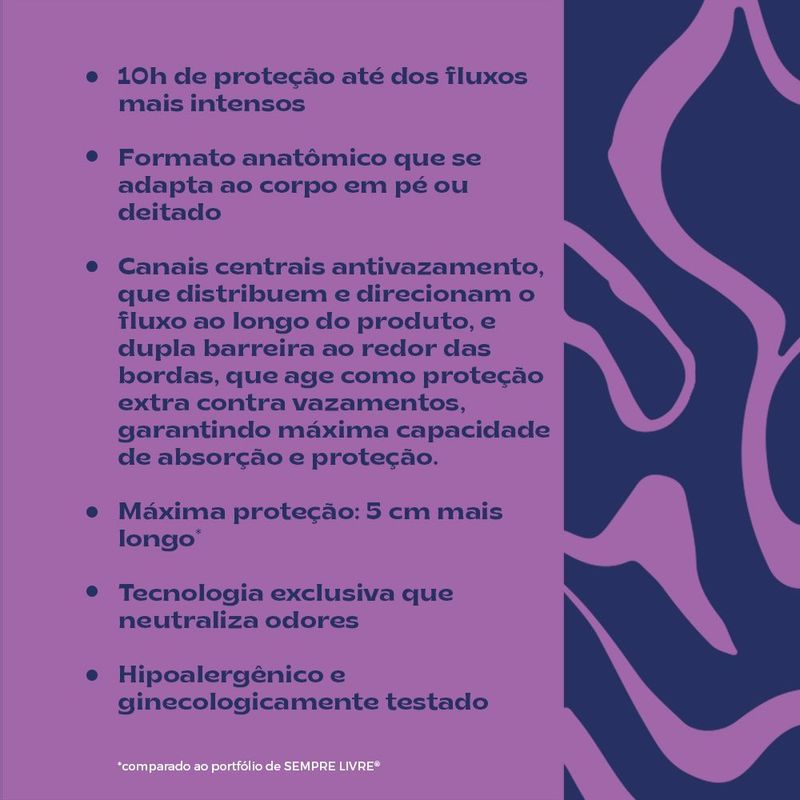 Absorvente Sempre Livre Adapt Plus Noite E Dia Seca Com Abas 8 UnidadesO Absorvente Sempre Livre Adapt Plus tem capacidade de proteção muito maior, se ajusta à qualquer posição. É ideal para as mulheres que buscam uma noite de sono confortável com proteção. Com abas para melhor fixação e cobertura seca para mais proteção. Até 100% de proteção contra vazamentos! O exclusivo formato adapt plus foi criado para se adaptar às curvas e não sair do lugar