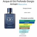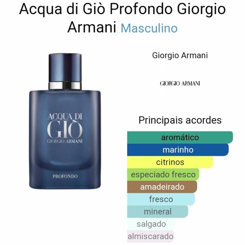 GIORGIO ARMANI Acqua Di Giò Profondo é a nova e intensa interpretação marinha de Acqua Di Giò, de Giorgio Armani. Como um mergulho no mar azul profundo, os sentidos são despertados pela tangerina verde e bergamota, enquanto um tom ultramarino e quase gelado é transmitido pelas icônicas notas marinhas de Acqua Di Giò. À medida que as bolhas de oxigênio sobem ao topo, o alecrim, a lavanda, o cipreste e o lentisco se misturam no coração. Exalando um caráter masculino de profundidade e intensidade, notas de patchouli amadeirado e almíscar envolvente finalmente se fundem com o toque salino de um acorde de âmbar mineral na base. Criado pelo mestre perfumista Alberto Morillas, Acqua Di Giò Profondo é encapsulado no emblemático frasco de vidro fosco em um elegante azul marinho quase opaco e profundo, ecoando as profundezas do mar. Mais do que uma fragrância, Aqua Di Giò Profondo é um mergulho poderoso na profundidade da alma, abraçando os valores de liberdade, sensorialidade e masculinidade moderna, revelando uma dimensão cada vez mais profunda. Para homens que possuem uma profunda ligação com a natureza e que desejam uma fragrância refinada, contemporânea e marcante. Família Olfativa: Notas de coração: Alecrim, Lavanda e Madeira Cipestre Notas de Fundo: Patchouli e Almíscar Notas de Cabeça: Mandarina Verde e Notas marinhas.