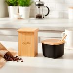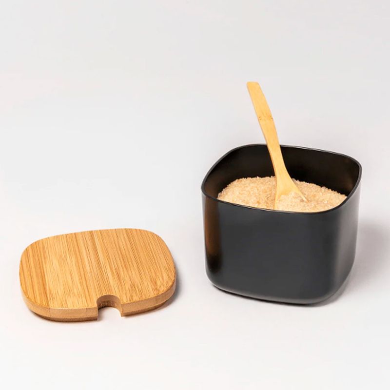 O conjunto com porta cafe em bambu e açucareiro preto com colher é funcional e elegante, ideal para organizar e servir cafe e açucar com praticidade no dia a dia. O porta cafe em bambu natural ajuda a proteger o conteudo da umidade, enquanto o açucareiro com acabamento moderno em poliestireno e tampa em bambu combina durabilidade, praticidade e um visual sofisticado. Uma combinaçao versatil que valoriza a organizaçao da cozinha ou da mesa com estilo e funcionalidade. Contem: 1 Porta Cafe com Tampa Medidas: 9 x 9 x 14 cm Material: Bambu 1 Açucareiro Preto com colher Medidas: 11,5 x 10,5 x 9 cm Capacidade: 200 ml Material: Poliestireno e Bambu