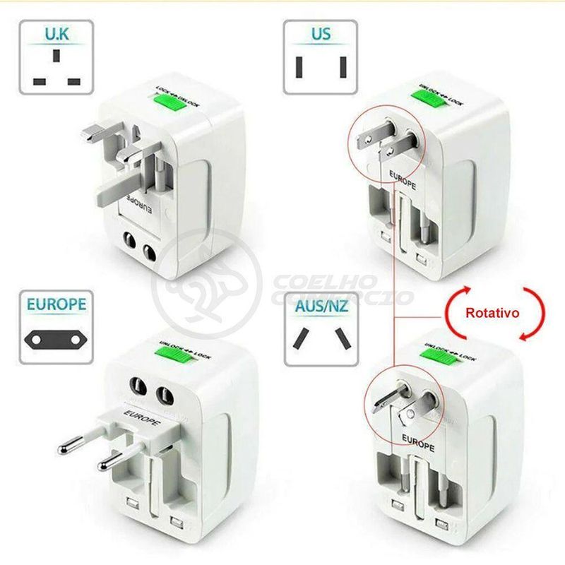 Adaptador Tomada Universal Padrão 150 Países Uk Europa Eua Asia Viagem Bivolt 110/220 Bivolt AioVocê é uma pessoa que sempre esta viajando? E já ficou sem carregar seu Notebook ou qualquer aparelho eletrônico, porque onde você ficou hospedado não tinha o padrão de tomada compatível? Este problema acabou! Aqui esta o mais novo Adaptador Universal de Tomadas, compatível com mais de 150 padrões de países.O produto é Ideal para você levar em todas as suas viagens, pois, ele se adapta em qualquer padrão de tomada, com isso você não precisa mais se preocupar em levar um monte de adaptadores para cada aparelho eletrônico.Incrível não é mesmo? Não deixe de adquirir o seu Adaptador Universal compatível com mais de 150 países. Aproveite!Máxima Voltagem de Entrada:250VMáxima Corrente de Entrada:10ADimensões:Altura: 7,5 cmLargura: 5 cmProfundidade: 4 cmPeso: 90gConteúdo da Embalagem:1 - Adaptador de Tomadas Universal 150 países1 - Caze Para Armazenamento1 - Manual de InstruçõesCertificador: ABILITNº Certificado: ABY-OCP-2021/0143