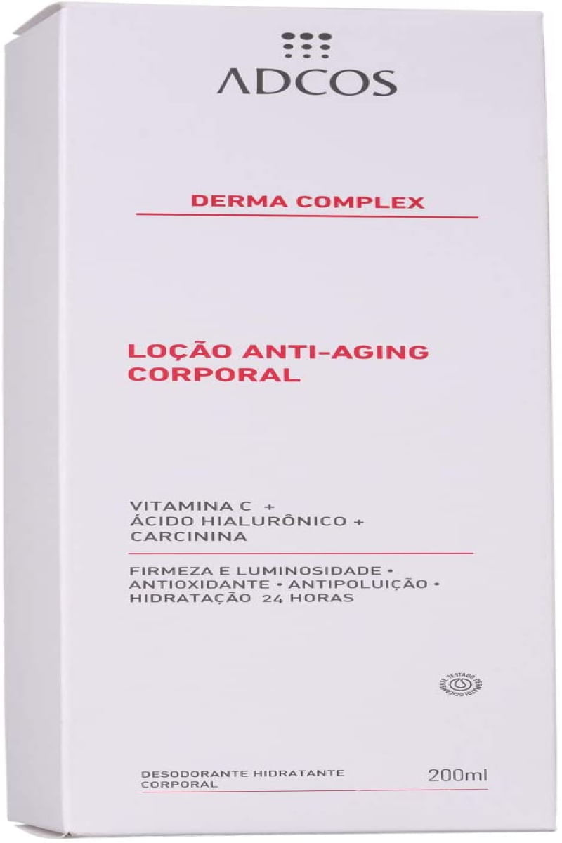 Derma Complex Adcos Lo??o Anti-Aging Corporal 200ml Adcos Derma Complex Loção Anti-Aging Corporal é composto por uma mix de ativos que são responsaveis por tratar diferentes sinais de envelhecimento da pele.Seu uso diáro trata a pele deixando mais saudavel, uniformizando o tom graças a sua textura e proporcionando uma iluminação natural.Sua fórmula possui Vitamina C e que trazem os beneficios antioxidantes protegendo dos danos causados por poluição.