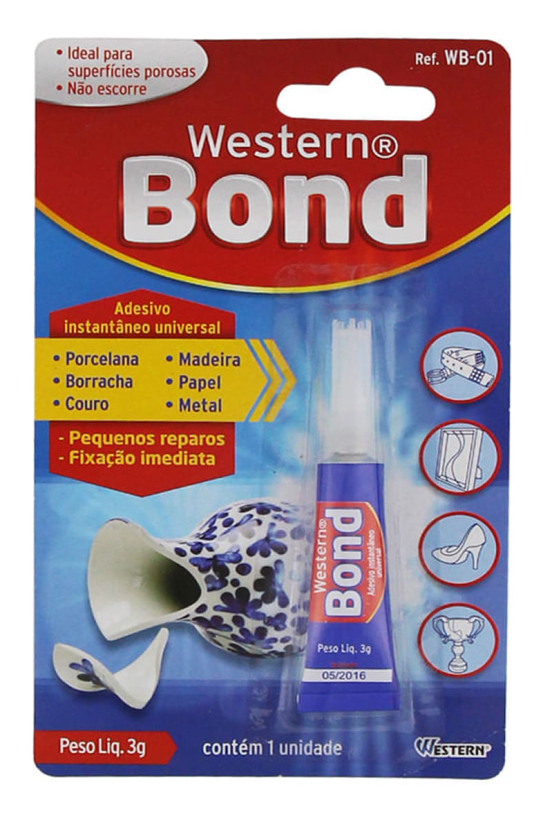 Adesivo Instantaneo Universal WesternCaracterísticas do Produto:Marca:WesternAltura:16.5cmLargura:1.4cmComprimento:10cmPeso: 800gOrigem: ImportadoGarantia do produto: 90 dias de garantia de acordo com o Código de Defesa do Consumidor + a Garantia do Fabricante