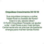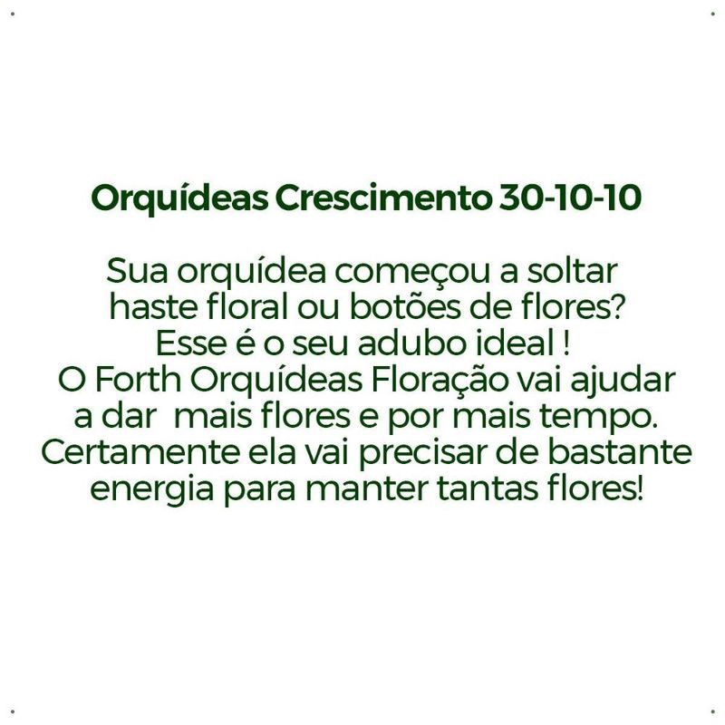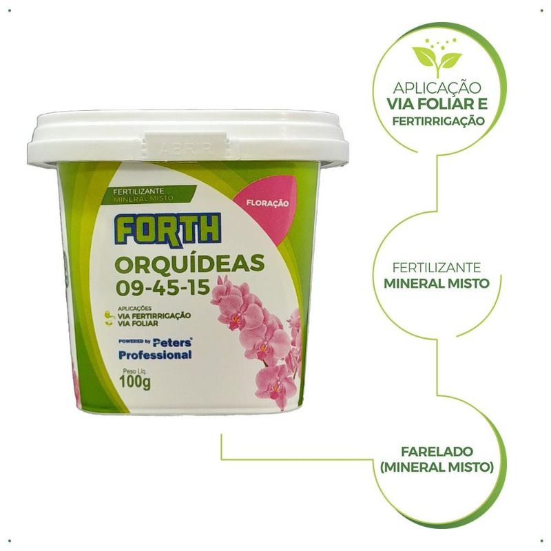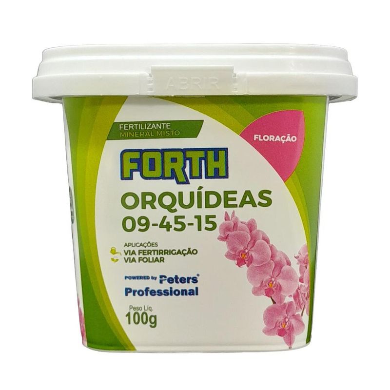 Adubo Forth Orquídeas Floração - 100g Se você está prestes a testemunhar o espetáculo mágico das hastes florais ou botões de flores em sua orquídea, é hora de dar a ela o suporte necessário para um show de floradas espetacular! Apresentamos a você o Forth Orquídeas Floração 09-45-15, o verdadeiro maestro que transformará sua orquídea em uma sinfonia de cores e fragrâncias. Imagine esse adubo como um impulso de energia concentrado para suas orquídeas em flor. Se a sua joia verde está prestes a desabrochar, o Peters é o segredo para garantir que ela não apenas floresça, mas que o faça de maneira magnífica e duradoura. Com uma fórmula cuidadosamente equilibrada de 09-45-15, este adubo é como um "kit de sobrevivência" para suas flores. Ele fornece os nutrientes essenciais necessários para que suas orquídeas desabrochem com vitalidade, produzindo flores exuberantes e abundantes. Não perca o momento! Quando sua orquídea está prestes a se transformar em uma cascata de flores, é quando ela mais precisa de energia. Não dorme no ponto, porque manter tantas flores não é tarefa fácil para ela. O Forth Orquídeas Floração está aqui para dar aquele empurrãozinho de energia que fará toda a diferença. Atenção: Não aplicar sobre botões florais e flores, evitar aplicações nas horas mais quentes do dia. A cada 3 meses utilize FORTH Equilíbrio. Caso a orquídea esteja com fungos, não efetuar adubação até resolver o problema.