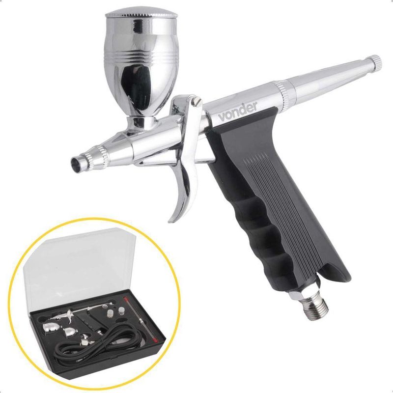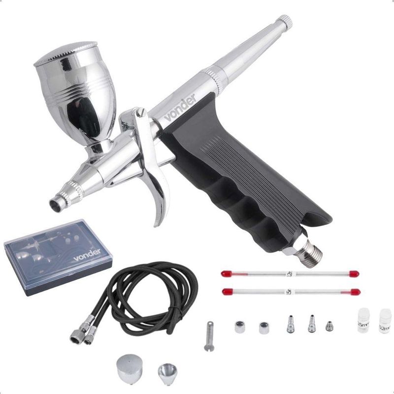 Aerógrafo Com Acessórios 16 Peças - Vonder**AERÓGRAFO COM ACESSÓRIOS 16 PEÇAS - VONDER**Descubra a excelência em pintura com o Aerógrafo Vonder, um conjunto completo com 16 peças que oferece precisão e controle para suas criações artísticas. Ideal para trabalhos detalhados, este aerógrafo é perfeito para micropinturas, retoques e personalizações em veículos, capacetes e muito mais. Com adaptadores inclusos, a conexão com compressores é fácil e rápida, garantindo que você possa começar a trabalhar sem complicações.O aerógrafo Vonder é fabricado com material de cobre de alta qualidade, proporcionando durabilidade e resistência. A pressão ajustável permite que você adapte o fluxo de tinta para diferentes tipos de aplicação, enquanto os bicos e agulhas intercambiáveis oferecem uma variedade de efeitos de pintura. Os copos de diferentes capacidades (2 ml, 5 ml e 13 ml) aumentam a versatilidade do uso, permitindo que você escolha o volume ideal para cada projeto. A mangueira flexível de 180 cm oferece liberdade de movimento, facilitando o manuseio durante o uso. Além disso, o sistema de sucção eficiente garante um fluxo de tinta constante e uniforme, essencial para resultados profissionais.**ESPECIFICAÇÕES TÉCNICAS**- Material do aerógrafo: Cobre- Marca: Vonder- Capacidade do copo: 13 mL- Capacidade do depósito: 2 mL- Comprimento da mangueira: 180 cm- Inclui compressor de ar: Não- Inclui estojo: Não- Inclui copo: Sim- Inclui mangueira: Sim- Função de alavanca: Dupla ação- Modelo: 6220016000- Espessura da agulha: 0.02 mm- Pressão recomendada: 3.447 bar- Peso: 0.8 kg- Com depósito: Sim**FUNÇÕES E CARACTERÍSTICAS**- Precisão e controle para pinturas detalhadas- Adaptadores para fácil conexão com compressores- Pressão ajustável para diferentes aplicações- Bicos e agulhas intercambiáveis- Copos de diferentes capacidades- Acabamento de alta qualidade- Sistema de sucção eficiente- Mangueira flexível de 180 cm**ITENS INCLUSOS**- 1 Aerógrafo com 16 acessórios- 1 Pistola- 1 Mangueira de 1,8 metros- 3 Copos (2 ml, 5 ml, 13 ml)- 3 Bicos (0,2 mm, 0,3 mm, 0,5 mm)- 3 Agulhas (0,2 mm, 0,3 mm, 0,5 mm)- 1 Chave- 1 Adaptador (1/4 NPT fêmea - 1/8 NPT macho)- 2 Conectores para mangueira (rosca 1/8? NPT fêmea com espigão 3/16?)- 1 Tubo de sucção**GARANTIA**Garantia legal de 90 dias + Garantia contratual de 3 meses. Para acionar a garantia, entre em contato com nosso suporte, que estará pronto para auxiliá-lo.**INSTRUÇÕES DE USO**1. Conecte o aerógrafo ao compressor utilizando os adaptadores inclusos.2. Selecione o bico e a agulha desejados para o efeito de pintura.3. Ajuste a pressão conforme necessário para o tipo de aplicação.4. Encha o copo com a tinta apropriada.5. Inicie a pintura, mantendo o aerógrafo a uma distância adequada da superfície.**ORIGEM DO PRODUTO**BrasilAdquira já o seu Aerógrafo Vonder e eleve suas criações artísticas a um novo patamar de qualidade e precisão! Produto: Aerógrafo