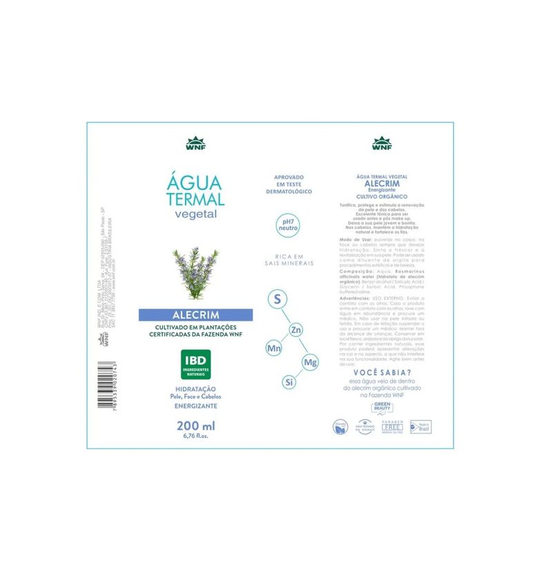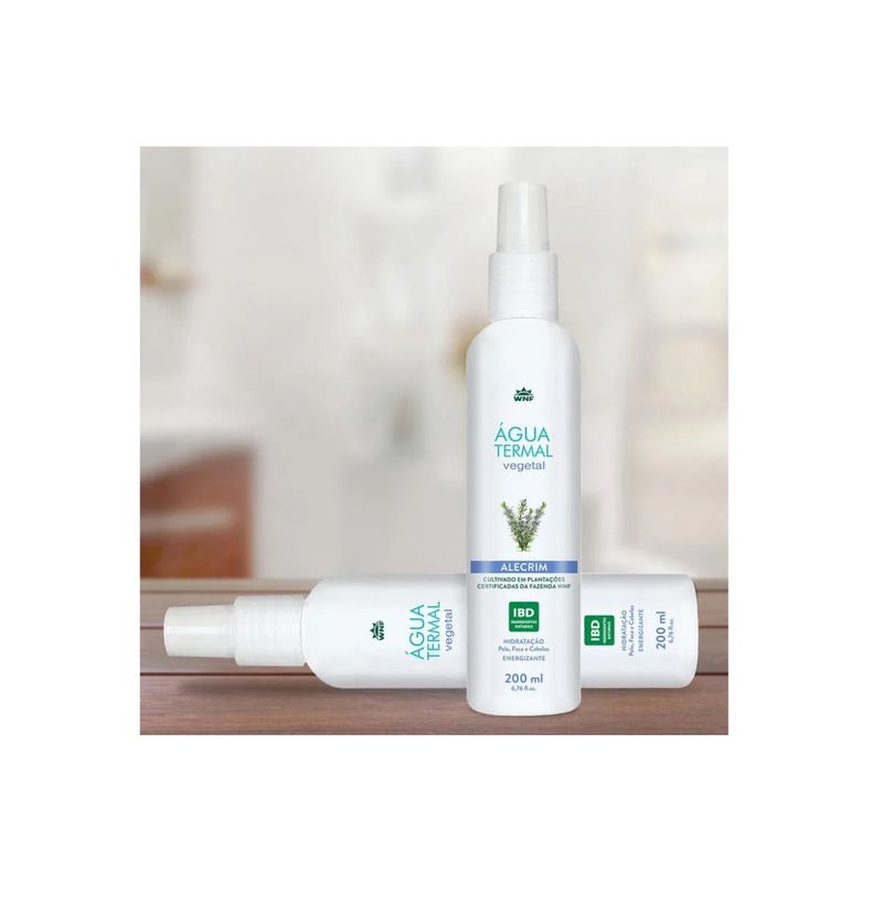 Água Termal Alecrim WNF para Pele, Face e Cabelos 200ml. A Água Termal de Alecrim WNF é rica em sais minerais de origem vegetal como o Zinco, Fósforo, Enxofre, Silício, Telúrio, Magnésio, Cálcio, Ferro, Potássio, Sódio. Hidrata, nutre, tonifica, revitaliza, fortalece e equilibra a pele. Tem efeito antioleosidade. É vasodilatadora, auxilia na limpeza dos poros, ideal para ser usada como adstringente. É um produto hipoalergênico. Nos cabelos, hidrata e diminui o frizz, auxilia na renovação e crescimento de novos fios. Um produto com garantia de qualidade WNF, não testado em animais e vegano. Matéria prima orgânica e natural, extraída da Fazenda das Lavandas WNF. Modo de Usar: Pulverizar no rosto, cabelos ou corpo para cuidado extra. No rosto, utilizar após limpeza facial e antes da hidratação. Nos cabelos, pode ser utilizado no couro cabeludo ou nos fios, como método antifrizz. Utilizar como base para umedecer argilas. Composição: Aqua - Rosmarinus officinalis water - Benzyl alcohol / Salicylic acid / Glycerin / Sorbic Acid - Phosphat buffered saline. Tipo de Pele: Todos os tipos de pele. Aroma: Alecrim. Volume: 200ml. Todas as informações divulgadas são de responsabilidade do fabricante/fornecedor. Imagens meramente ilustrativas.