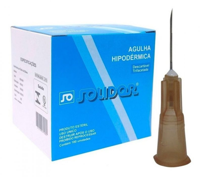 DescriçãoAGULHA HIPODÉRMICA DESCARTÁVEL - SOLIDOR(CAIXA COM 100 UNIDADES)Agulha descartável, corpo de aço inoxidável biselado, canhão em plástico, provida de protetor, esterilizada a óxido de etileno, embalada individualmente.- Cânula siliconada que desliza facilmente, diminuindo a dor do paciente- Bisel trifacetado que torna a aplicação mais fácil e reduz a dor do paciente- Canhão colorido que facilita a identificação visual do calibre da agulha- Protetor plástico que garante total proteção da agulha para um melhor acoplamento à seringa- Código EAN nas embalagens unitárias e nas caixasEspecificações- Descartável- Estéril- Caixa com 100 unidadesTamanhos Disponíveis:13 x 4,5 (26Gx1/2")20 x 5.5 (24Gx3/4")25 x 6 (23Gx 1")25 x 7 (22Gx 1")25 x 8 ( 21Gx 1")30 x 7 (22Gx1.1/4")30 x 8 (21Gx 1.1/4")40 x 12 (18Gx1.1/2")