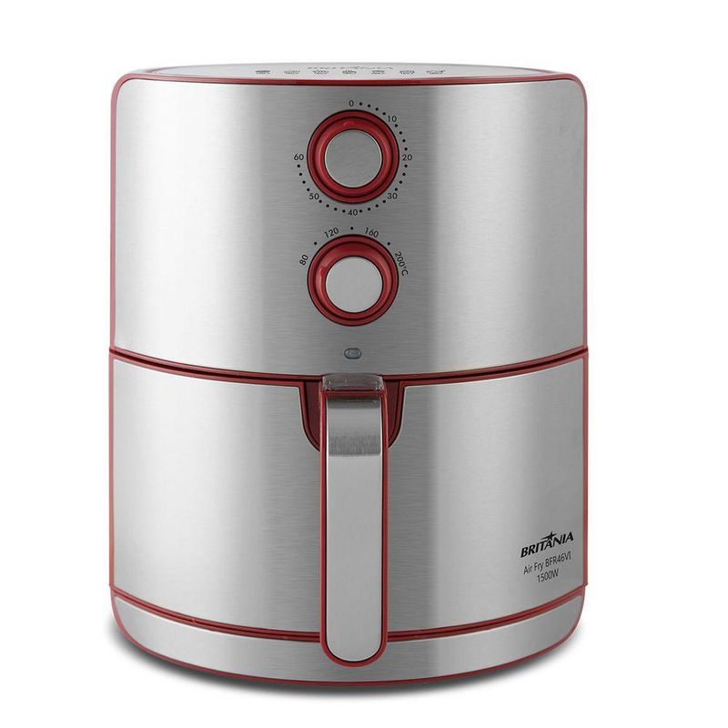 Air Fryer Britânia 4,6L Antiaderente 1500W BFR46VI 220VSua melhor aliada na cozinha, a Air Fryer Britânia 4,6L Antiaderente 1500W BFR46VI garante alimentos saborosos e saudáveis em poucos minutos, isso porque ela frita com pouquíssimo ou nenhum óleo e possui 1500W de potência, proporcionando mais agilidade e praticidade no seu dia a dia. A cuba com capacidade de 4,6L e o cesto de 3,5L permitem preparar alimentos para toda a família. Sem falar que o cesto é removível e possui revestimento antiaderente mais durável, fácil de limpar e que não deixa os alimentos grudarem. A Air Fryer Britânia BFR46VI possui diferentes opções de temperaturas de 80 a 200 graus, além de função timer de até 60 minutos, luzes indicadoras de funcionamento e desligamento automático. Com design em inox que deixa a sua cozinha mais elegante, a BFR46PI é a escolha perfeita para receitas mais gostosas e rápidas.Principais Características:Frita com pouquíssimo ou nenhum óleoSeletor de temperatura com ajuste de 80 a 200 graus Timer mecânico de 60 minutos Capacidade do cesto 3,5L Capacidade da cuba de 4, 6 litros Luz indicadora de funcionamento/Aquecimento Desligamento automático Base antiderrapante Cesto removível com revestimento antiaderente Trava de segurança Sistema de proteção contra superaquecimento Acabamento em inox Composição: Metal e Plástico.Especificações Técnicas:Marca: BritâniaTipo: Sem óleoModelo: BFR46VIPotência (W): 1500 WFunção timer: SimEstado: NovoCor: PrataCesto antiaderente: SimCapacidade: 4,6 LControle de temperatura: 80 a 200 grausCesto removível: SimAltura do produto: 33,4 cmLargura do produto: 28,5 cmComprimento do produto: 37,5 cmPeso do produto: 4,73 kgAltura com embalagem: 37 cmLargura com embalagem: 32 cmComprimento com embalagem: 32 cmPeso com embalagem: 5,39 kgGarantia (Dias): 360Observação: Somente faturamos para o nosso consumidor final, ou seja, não faturamos pedidos para CNPJ por este portal de vendas;