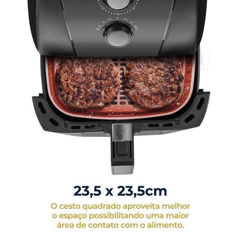 Air Fryer Britânia 5,5L Antiaderente Redstone 1500W BFR50 110VA Air Fryer Britânia 5,5L 1500W Revestimento Redstone BFR50 é a aliada perfeita para uma culinária prática e saudável. Com uma capacidade útil de 5,5 litros e um cesto quadrado, oferece muito mais espaço para preparar grandes porções, permitindo que mais alimentos sejam preparados sem necessidade de empilhar um sob o outro, ideal para toda a família!Outro diferencial da Air Fryer Britânia BFR50 é o exclusivo antiaderente Redstone. Ele possui tecnologia de nano cerâmica aplicada ao revestimento que proporciona excelente dissipação de calor, aquece mais rápido o cesto e preserva o sabor dos alimentos. É menos poroso, mais durável e resistente ao desgaste diário.O revestimento antiaderente Redstone também garante que os alimentos não grudem, o que torna a limpeza extremamente prática e fácil, permitindo que seja realizada apenas com papel toalha.Além disso, a tecnologia Air Flow é a circulação de ar quente em 360°C que proporciona agilidade e eficiência no preparo dos alimentos. Tudo isso com seu poderoso motor de 1500W que garante eficiência e rapidez no preparo das suas receitas favoritas. E o melhor de tudo é que você tem refeições saborosas sem precisar usar óleo.Desfrute de uma alimentação mais saudável sem abrir mão do sabor e da praticidade. Air Fryer Britânia 5,5L Redstone BFR50, seu dia a dia no modo Britânia!Principais Características:- Frita com pouquíssimo ou nenhum óleo- Seletor de temperatura com ajuste de 80 a 200°C- Cesto com revestimento antiaderente- Capacidade do cesto de alimentos: 5,5L- Capacidade do coletor de resíduos: 5,5L- Timer mecânico de 60 minutos- Luz indicadora de funcionamento- Desligamento automático- Base antiderrapante- Sistema de proteção contra sobreaquecimento- Acabamento em inox.Especificações Técnicas:Marca: BritâniaModelo: BFR50Cor: PretoTipo: Sem óleoPotência (W): 1500 WFunção timer: SimMarca: BritâniaEstado: NovoTido de controle: AnalógicoCesto antiaderente: SimCapacidade: 5,5 LControle de temperatura: 80°C a 200°CCesto removível: SimAltura do produto: 33 cmLargura do produto: 28 cmComprimento do produto: 36 cmPeso do produto: 4,1 kgAltura com embalagem: 36 cmLargura com embalagem: 40,5 cmComprimento com embalagem: 32 cmPeso com embalagem: 4,75 kgGarantia (Dias): 360Observação: Somente faturamos para o nosso consumidor final, ou seja, não faturamos pedidos para CNPJ por este portal de vendas;