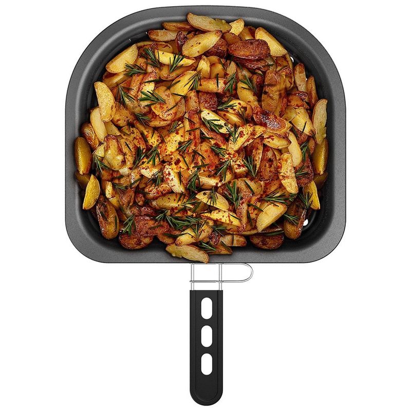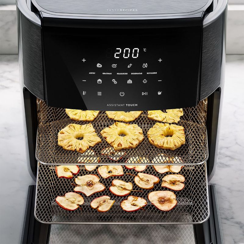 A Air Fryer Oven por Rita Lobo 12 Litros Electrolux (EAF90) combina alta potência, ampla capacidade e cinco modos de preparo para oferecer eficiência e versatilidade à sua cozinha. Conheça mais sobre Air Fryer Oven 12 litrosAlém disso, é equipada com tecnologias e recursos que promovem facilidade à rotina, como o painel digital com funções e receitas pré-selecionadas. Diferenciais da Air Fryer Oven 12 litros Além de amplo espaço interno, apresenta diferenciais que promovem mais versatilidade no preparo dos alimentos. Grande capacidade: 12 litros de capacidade para preparar todo tipo de receitas em diversas porções;Air Fryer 5 em 1: fritadeira elétrica forno com 5 modos de preparo em 1 único produto: air fry, gratinar, reaquecer, desidratar e rotisserie;Função Rotisserie: aciona o espeto giratório, que assa por igual frangos, legumes, carnes e outros, enquanto rotaciona o alimento;Função Desidratar: você consegue preparar deliciosos chips de frutas e legumes. É tão intuitivo. O processo conta com temperatura e tempo ajustáveis, de 2h a 24h;Função Gratinar: para finalizar seus pratos com uma camada crocante. Ela é ideal para batatas recheadas, por exemplo;Função Reaquecer: perfeita para aquecer os alimentos que saíram direto da geladeira e para reaquecer pães e pizzas, sempre mantendo aquela crocância;Função Air fry: para assar ou fritar os pratos de sua preferência ou preparar uma das 7 receitas pré-selecionadas. Faça carne, frango, peixe, legumes, batata, pão de queijo e bolo com apenas um toque;Kit de acessórios: duas grelhas, espeto giratório e gancho, bandeja coletora de resíduos e cesto interno de 3,5 litros.Ao preparar receitas na Air Fryer Oven 12 litros, você reduz o consumo de óleo e faz receitas com até 90% a menos de gordura e quase 50% a menos de calorias. Além de preparar comida saudável, você deixa de descartar até 24 litros de óleo por ano, contribuindo com um consumo mais sustentável. Tecnologias da Air Fryer Oven 12 litros Com as melhores tecnologias e funcionalidades extras, a fritadeira Air fryer Oven 12 litros oferece mais facilidade no uso. Conheça os principais recursos: Painel digital: mais de 10 funções programadas. Além dos 5 modos de preparo e das 7 receitas pré-selecionadas, traz ainda as funções Pré-aquecer e Virar;Função Pré-aquecer: indica quando a fritadeira elétrica atinge a temperatura ideal e está pronta para uso;Função Virar: emite um aviso sonoro e luminoso que indica o momento certo de virar ou mexer o alimento para assar ou fritar por igual;Botão seletor de temperatura: permite definir a temperatura entre 60°C e 200°C, chegando ao ponto ideal de diversas receitas.Principais perguntas sobre Air Fryer Oven 12 litros Como escolher uma Air Fryer?Ao escolher uma Air Fryer, é importante considerar alguns aspectos. Confira: Capacidade: escolha uma capacidade que seja adequada à quantidade de pessoas em casa e ao tamanho das porções que você costuma preparar;Funções: confira as funcionalidades que cada modelo oferece a fim de garantir mais versatilidade no preparo dos alimentos;Voltagem: escolha entre a air fryer 12 litros 220V ou 110V, de acordo com a tensão elétrica da sua casa;Recursos: avalie os recursos e tecnologias que a air fryer oferece e que facilitam a rotina, como função virar e painel digital com receitas pré-selecionadas.O que uma Air Fryer precisa ter para ser boa? Uma boa Air Fryer combina alta potência, capacidade adequada às suas necessidades e funcionalidades que tornam o preparo dos alimentos mais fácil. A Air Fryer Oven Electrolux 12L, por exemplo, conta com 1700W de potência, 12 litros de capacidade e recursos que oferecem versatilidade na cozinha, como os cinco modos de preparo e o painel digital com funções e receitas pré-programadas. O que é Air Fryer Oven? A Air Fryer oven é um modelo de fritadeira elétrica multifuncional, combinando funções de uma air fryer e de um forno. Além de fritar sem óleo, como os produtos tradicionais, ela oferece outros modos de preparo. É o caso da Air Fryer Oven Electrolux 12L, que além da função air fryer, também conta com as funções reaquecer, desidratar, gratinar e rotisserie. Qual a melhor Air Fryer de 12 litros?A Air Fryer Oven Electrolux 12L se destaca entre as melhores Air Fryers de 12 litros. Afinal, além de amplo espaço interno e alta potência, ela oferece cinco modos de preparo e conta com recursos que facilitam o preparo dos alimentos, como o painel digital, as funções virar e pré-aquecer e um kit de acessórios completo que promove versatilidade na cozinha. Qual Air Fryer gratina e desidrata alimentos? A Air Fryer 12 litros Electrolux gratina e desidrata os alimentos, além de permitir outros três modos de preparo: a função reaquecer, air fryer e rotisserie.