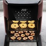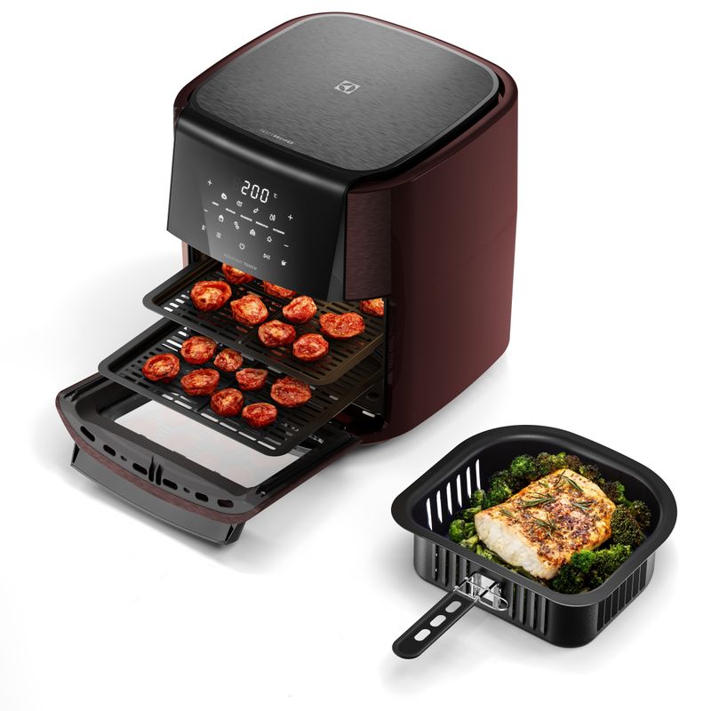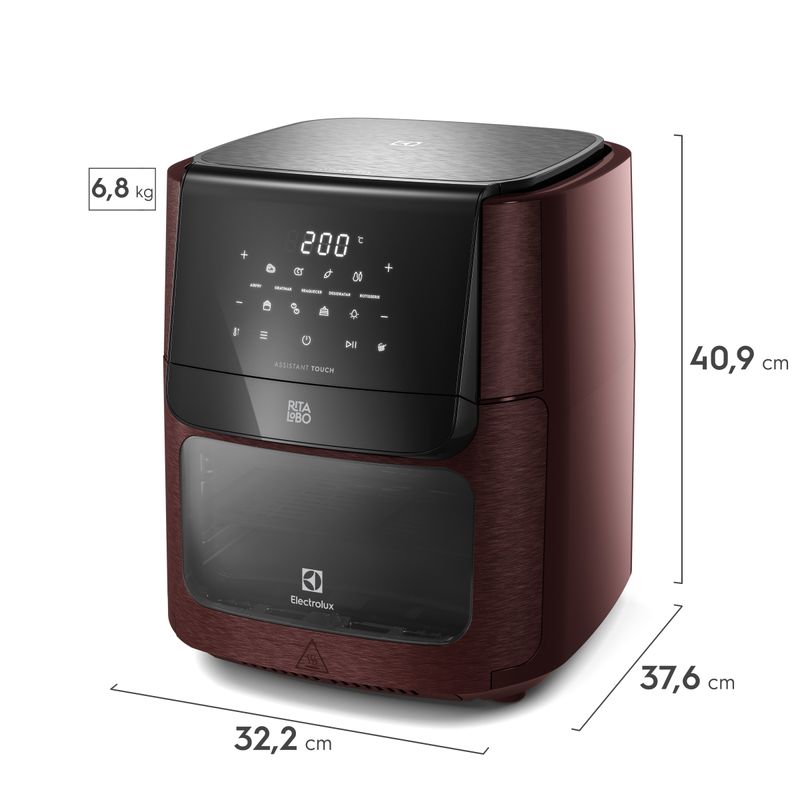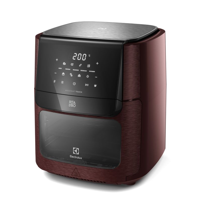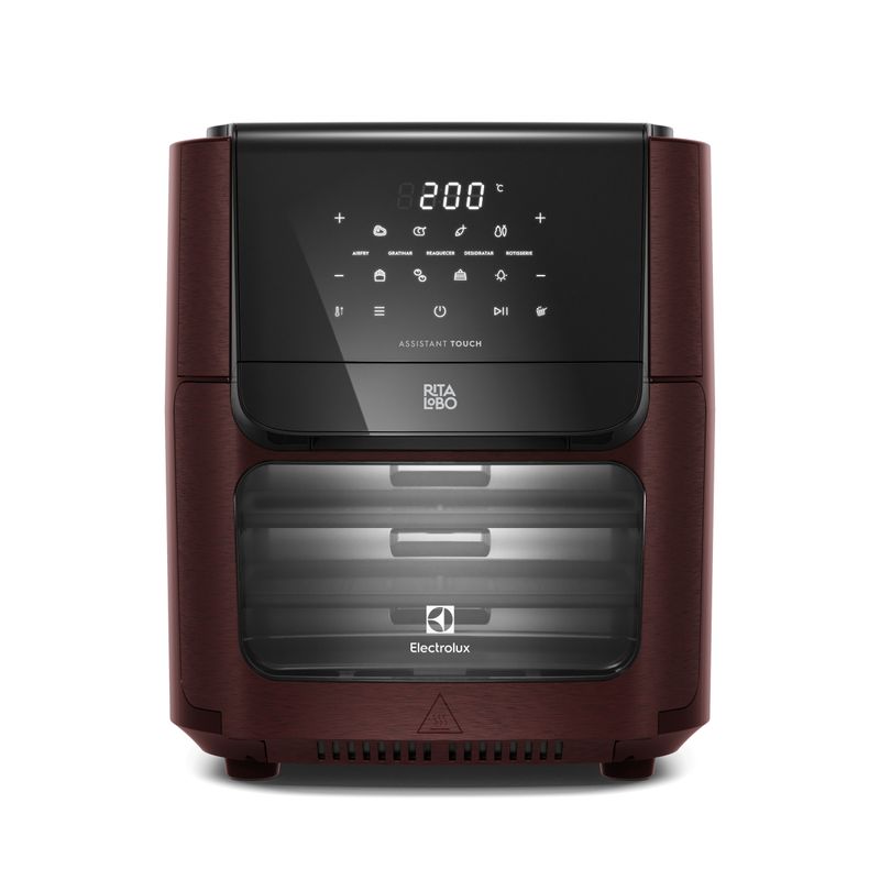 A Air Fryer Oven Electrolux (EAF91) é de uso multifuncional para quem quer preparar comida de verdade, mantendo uma alimentação saudável e saborosa. Ao preparar receitas na air fryer, você reduz o consumo de óleo e faz receitas com até 90% a menos de gordura e quase 50% a menos de calorias.Conheça mais sobre Air Fryer Oven vermelha escura Além de preparar comida saudável, você deixa de descartar até 24L de óleo por ano, contribuindo com um consumo mais sustentável. Diferenciais da Air Fryer Oven vermelha escuraA Air Fryer Oven Electrolux oferece a melhor experiência no preparo de receitas saudáveis no dia a dia da sua cozinha. Painel Digital com mais de 10 funções: além dos 5 métodos de preparo, tem 7 receitas pré-programadas, função Preaquecer e função Virar;Kit de acessórios incluso: duas grelhas, bandeja coletora, espeto giratório e gancho para um manuseio seguro, além de cesto antiaderente de 3,5L com puxador removível;Ajustável para diferentes receitas: 5 posições disponíveis para ajuste das grelhas;Porta de vidro e luz interior: com apenas um toque no painel, ative a luz interior para acompanhar o preparo. A porta também é facilmente removível, o que simplifica a limpeza.Comando pausa e play: controle tudo com um único toque – pause para monitorar a receita e play para continuar de onde parou.Tecnologias da Air Fryer Oven vermelha Com 12L de capacidade, este aparelho é ideal para preparar todos os tipos de receitas em diversas porções. Air fryer 5 em 1: são 5 modos de preparo em 1 único produto para garantir a textura ideal em suas receitas com muito sabor. Experimente as funções: Airfry, Gratinar, Reaquecer, Desidratar e Rotisserie;Botão seletor de temperatura: defina a temperatura desejada entre 60°C a 200°C para alcançar o ponto certo;Desligamento automático: no fim do preparo, a fritadeira elétrica sem óleo desliga automaticamente, mantendo os alimentos no ponto desejado;1700W de potência: prepare seus pratos preferidos com rapidez.Principais perguntas sobre Air Fryer Oven Vermelha Escura Qual a diferença entre uma Air Fryer e uma Air Fryer Oven?As principais diferenças entre uma Air Fryer e uma Air Fryer Oven estão na capacidade, potência e funcionalidade dos modelos. A Air Fryer Oven oferece os seguintes diferenciais: Maior capacidade: a partir de 10L, para preparos mais volumosos;Alta potência: potências acima de 1500W para maior agilidade em diversos tipos de preparos;Mais funções: combina as funcionalidades da air fryer convencional com as de um forno, com opções como gratinar, reaquecer, desidratar e rotisserie.Qual o melhor Air Fryer Oven? Um bom modelo deve ter as seguintes características: Alta potência para diversos preparos;Boa capacidade em litros;Diversos modos de preparo;Acessórios como grelhas e espetos inclusos;Painel funcional;Funções e comandos extras para mais simplicidade e agilidade no dia a dia.Quantos watts têm que ter uma Air Fryer boa? As Air Fryers convencionais costumam ter potência entre 800W e 1500W, enquanto os modelos de Air Fryer Oven oferecem potências acima de 1500W. Quanto maior a potência, mais rapidamente o produto alcança altas temperaturas e mais ágeis são os preparos de diversas receitas. Qual a melhor Air Fryer digital ou manual?As air fryers manuais oferecem um controle simplificado de temperatura e demais ajustes, com botões analógicos e poucos menus. Já os modelos de air fryer digital contam com painéis digitais que permitem ajustes rápidos e precisos, com mais possibilidades de ajuste e programas automáticos.