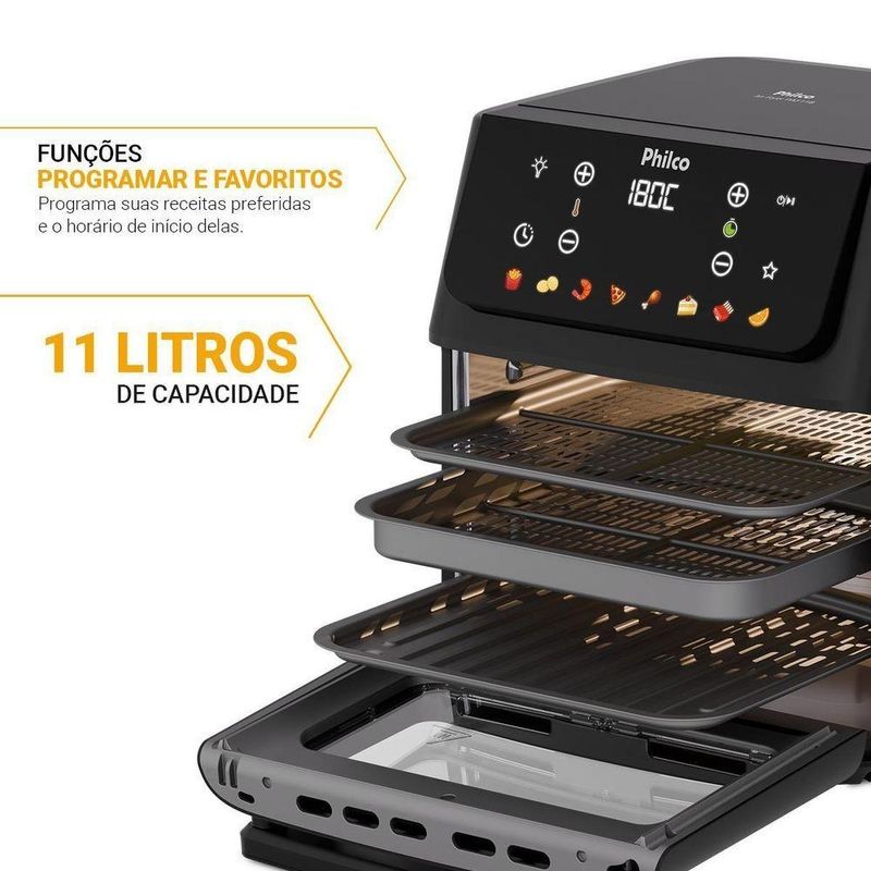 Air Fryer Oven Philco 11L 8 Funções Visor 1800W PAF11B 110VImagine preparar pratos deliciosos com o sabor de sempre, mas sem óleo e com muito mais praticidade. A Air Fryer Oven Philco 11L 8 Funções Visor 1800W PAF11B transforma sua rotina na cozinha, unindo potência, capacidade e design moderno em um só aparelho.Com 8 funções pré-programadas, basta escolher o programa e deixar que ela faça todo o trabalho por você, crocância e sabor garantidos, sem esforço! A capacidade de 11 litros da Air Fryer Philco, acomoda receitas para toda a família, enquanto a função Programar e o Menu Favorito trazem liberdade para planejar suas refeições e preparar tudo com um toque.A porta com visor permite acompanhar cada etapa sem abrir a Air Fryer PAF11B, mantendo o calor e a textura perfeita dos alimentos. Além disso, o cesto com revestimento antiaderente e as peças laváveis na lava-louças tornam a limpeza leve e descomplicada.Com tecnologia, beleza e praticidade, a Air Fryer Oven Philco 11L 8 Funções Visor 1800W PAF11B é o toque de modernidade que faltava na sua cozinha.Principais CaracterísticasPotência de 1800WCapacidade total de 11LCapacidade do cesto de 1,5L8 funções pré-programadasControle de temperatura: 40°C a 200°CPainel digital com timer de 60 minFunções: Programar, Menu Favorito e AgitarPorta removível com visorCesto e assadeiras antiaderentesDesligamento automático e proteção contra sobreaquecimentoBase antiderrapante e cabo de 90cmObservação: Somente faturamos para o nosso consumidor final, ou seja, não faturamos pedidos para CNPJ por este portal de vendas.Especificações TécnicasMarca: PhilcoModelo: PAF11BCor: PretoTipo: Sem óleoPotência (W): 1800WFunção timer: SimEstado: NovoTipo de controle: DigitalCesto antiaderente: Simofficialstoreid_meli: 199meli_shipping_mode: me2Capacidade: 11LControle de temperatura: 40°C a 200°CFundo Removível: SimCesto removível: SimAltura do produto: 33 cmLargura do produto: 34,5 cmComprimento do produto: 31 cmPeso do produto: 4,7 kgAltura com embalagem: 36 cmLargura com embalagem: 38,2 cmComprimento com embalagem: 34 cmPeso com embalagem: 5,311 kgGarantia (Dias): 360