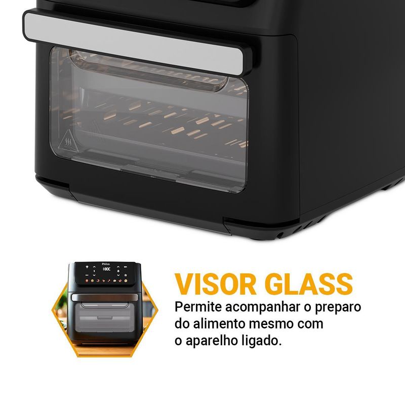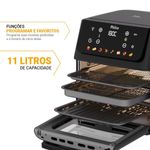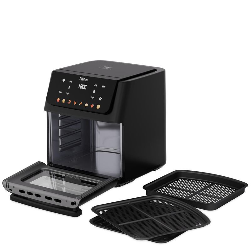 Imagine preparar pratos deliciosos com o sabor de sempre, mas sem óleo e com muito mais praticidade. A Air Fryer Oven Philco 11L 8 Funções Visor 1800W PAF11B transforma sua rotina na cozinha, unindo potência, capacidade e design moderno em um só aparelho.Com 8 funções pré-programadas, basta escolher o programa e deixar que ela faça todo o trabalho por você, crocância e sabor garantidos, sem esforço! A capacidade de 11 litros da Air Fryer Philco, acomoda receitas para toda a família, enquanto a função Programar e o Menu Favorito trazem liberdade para planejar suas refeições e preparar tudo com um toque.A porta com visor permite acompanhar cada etapa sem abrir a Air Fryer PAF11B, mantendo o calor e a textura perfeita dos alimentos. Além disso, o cesto com revestimento antiaderente e as peças laváveis na lava-louças tornam a limpeza leve e descomplicada.Com tecnologia, beleza e praticidade, a Air Fryer Oven Philco 11L 8 Funções Visor 1800W PAF11B é o toque de modernidade que faltava na sua cozinha.Potência de 1800WCapacidade total de 11LCapacidade do cesto de 1,5L8 funções pré-programadasControle de temperatura: 40°C a 200°CPainel digital com timer de 60 minFunções: Programar, Menu Favorito e AgitarPorta removível com visorCesto e assadeiras antiaderentesDesligamento automático e proteção contra sobreaquecimentoBase antiderrapante e cabo de 90cm