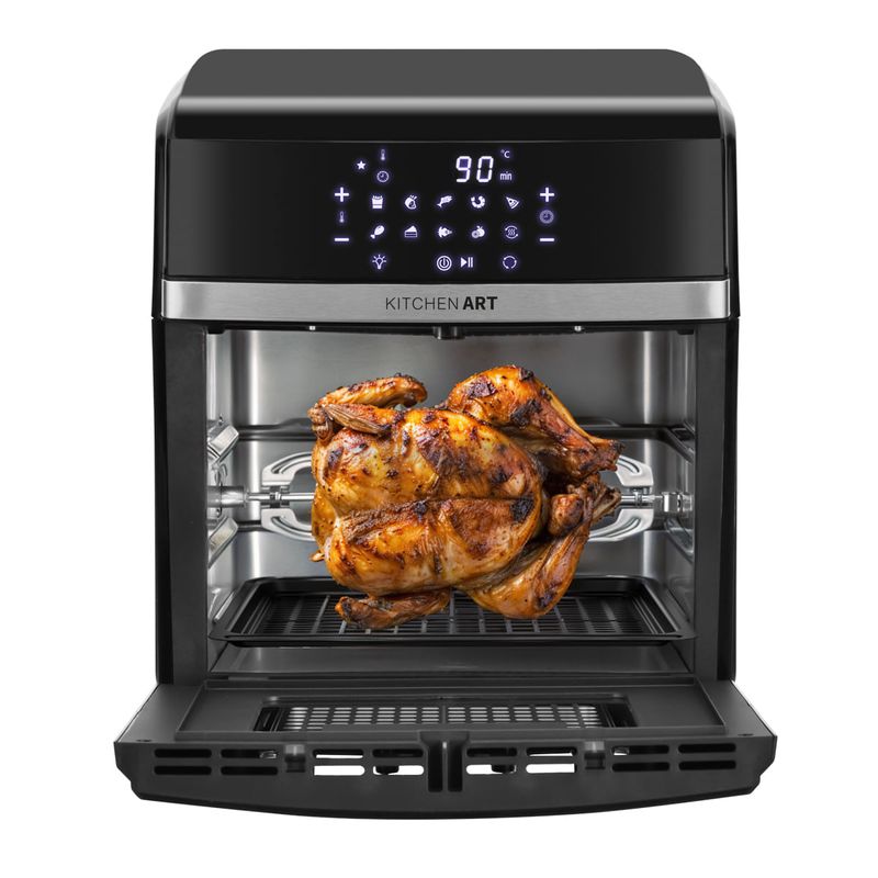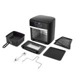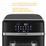 A Air Fryer Oven Philco Kitchen Art 12L Digital KFR02 é a solução ideal para quem busca refeições mais saborosas e saudáveis, sem precisar usar óleo. Com capacidade total de 12 litros, ela é perfeita para famílias grandes ou para quem gosta de receber convidados. O cesto de 4 litros permite preparar diferentes alimentos, como carnes, frangos, peixes, legumes, batatas fritas, salgadinhos e muito mais. Essa Air Fryer possui também controle de temperatura de 80 a 200 graus, assim você faz aquela receita que mais gosta do jeito que preferir, sem errar o ponto. Muito mais versátil e completa, com ela você assa, frita e desidratada alimentos. Perfeita! Além disso, é acompanhada de acessórios que facilitam o preparo de diferentes receitas, como 2 grelhas antiaderentes, 1 bandeja coletora de gordura e 1 garfo. Outro destaque que faz dela uma Air Fryer Oven diferenciada é o Espeto Rotisserie, que permite assar os alimentos de maneira uniforme, sem a necessidade de virar manualmente. O painel digital com 9 funções permite inovar nas receitas de forma rápida e fácil. Basta selecionar a função desejada e ajustar a temperatura e o tempo de preparo. O revestimento Fast Clean da Fritadeira é antiaderente, muito mais resistente e fácil de limpar, pois o alimento não gruda. Com a Air Fryer Oven Philco Kitchen Art você terá refeições mais saborosas e saudáveis, sem precisar usar óleo. • Frita com pouquíssimo ou nenhum óleo • Amplo painel digital com funções touchscreen (teclas sensíveis ao toque) • Painel com 12 funções sendo 10 funções de preparos predefinidas (tempo e temperatura de preparo predefinidos) • Opção de ajuste manual do tempo e temperatura de preparo • Display digital para visualização dos tempos e temperaturas de preparo • Iluminação interna • Seletor de temperatura com ajuste de 80 a 200 graus • Função desidratar com ajuste de temperatura de 30 a 80 graus • Timer de até 90min • Timer da função desidratar de 2h a 24h • Cesto de alimentos com revestimento antiaderente e com capacidade de 4L • Cesto de alimentos com cabo destacável • Capacidade interna: 12L • Acompanha 2 grelhas com revestimento antiaderente • 3 níveis de altura para ajuste das grelhas • Coletor de resíduos • Função espeto giratório (rotisserie), acompanha espeto e garfo para manuseio do espeto • Desligamento automático • Base antiderrapante • Sistema de proteção contra sobreaquecimento.