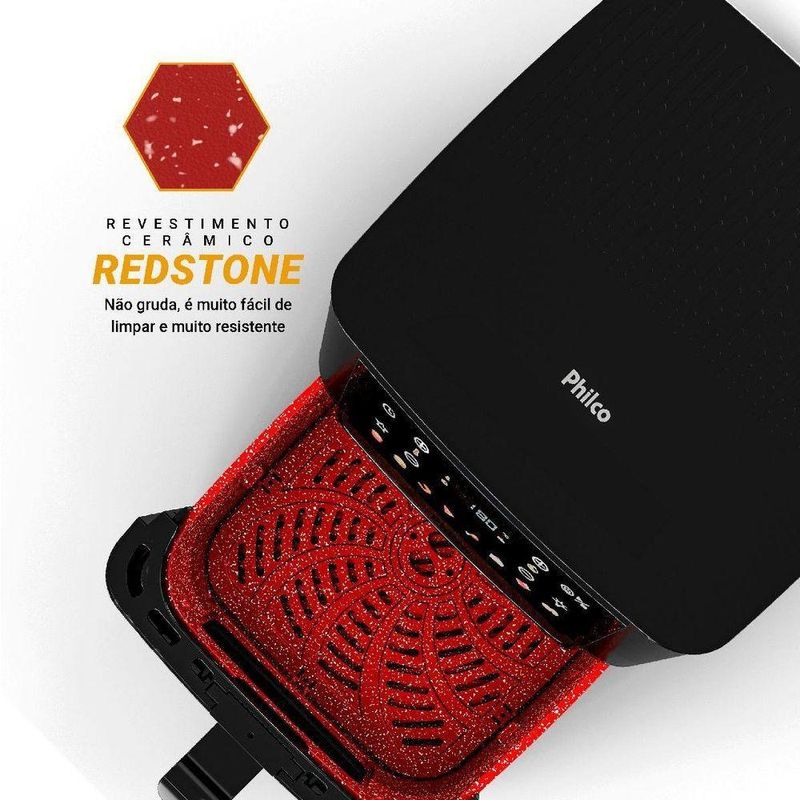 Air Fryer Philco 6,5L Visor Glass e Redstone PAF65A 220VDescubra a praticidade e o sabor que a Air Fryer Philco 6,5L Visor Glass 1700W PAF65A traz para sua cozinha. Com capacidade de 6,5 litros, a Air Fryer PAF65A prepara grandes quantidades de alimentos de uma só vez, ideal para refeições em família. O revestimento cerâmico Redstone evita que os alimentos grudem e facilita a limpeza, enquanto o visor glass permite acompanhar o preparo sem interromper o cozimento. Com potência de 1700W, timer de até 60 minutos e controle de temperatura de 80°C a 200°C, você prepara frituras, assados e grelhados com precisão e agilidade na sua Air Fryer Philco PAF65A. O painel digital oferece 8 funções pré-programadas, e a função favoritos salva suas configurações preferidas. Além disso, a PAF65A conta com sinal LED “turn” que avisa quando é hora de virar os alimentos, e o desligamento automático garante e conveniência. Transforme sua rotina e desfrute de refeições saudáveis e saborosas sem complicações. Air Fryer Philco 6,5L Visor Glass 1700W PAF65A, experimente o prazer de cozinhar com praticidade e eficiência! - Capacidade da cuba (L) 6,5L- Tipo de cesto: Quadrado- Potência: 1700W- Controle de temperatura, temp. máxima (°C): 40°C 200°C- Cuba e fundo removível revestido com antiaderente Redstone- Luz indicadora de funcionamento: Possui ícones luminosos por conta do painel digital- Desligamento automático- Base antiderrapante - Sistema de proteção contra sobreaquecimento - Pode ser levada à lava louças: Cuba e fundo removível- Comprimento do cabo de alimentação: 90cm exposto- Timer 60 minutos- Tipo de acabamento Preto Fosco e Inox- Funções pré-programadas 8 funções pré-programadas para alimentos- Função Programar- Função Favorito: Permite salvar configuração mais utilizada- Alça da Cuba removível.Especificações Técnicas:Marca: PhilcoTipo: Sem óleoPotência (W): 1700WFunção timer: SimModelo: PAF65AEstado: Tipo de controle: DigitalCor: PretoCesto antiaderente: SimCapacidade: ,5LControle de temperatura: 40°C a 200°CFundo Removível: SimCesto removível: SimAltura do produto: 30,3 cmLargura do produto: 28,2 cmComprimento do produto: 37,2 cmPeso do produto: 4,3 kgAltura com embalagem: 33,6 cmLargura com embalagem: 33,2 cmComprimento com embalagem: 31,6 cmPeso com embalagem: 4,9 kgGarantia (Dias): 360Observação: Somente faturamos para o nosso consumidor final, ou seja, não faturamos pedidos para CNPJ por este portal de vendas;
