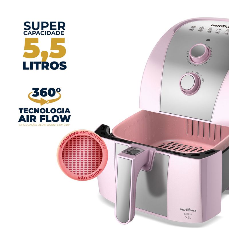 Descubra a praticidade e a eficiência da Air Fryer Rosa Britânia 5,5L Cesto Pinkstone 1500W BAFE53! Com capacidade de 5,5 litros, esta Air Fryer é perfeita para preparar desde receitas simples até pratos mais elaborados, facilitando o preparo das refeições para toda a família. Seus cestos espaçosos acomodam mais alimentos, permitindo um cozimento uniforme. Com 1500W de potência, a Air Fryer Britânia garante rapidez e eficiência em todos os tipos de preparos. Seu cesto quadrado e removível é projetado para acomodar melhor os alimentos, assando-os por igual. Além disso, a tecnologia de revestimento Antiaderente Pinkstone evita que os alimentos grudem, tornando a limpeza muito mais fácil e prática. A inovação não para por aí: a tecnologia Air Flow proporciona circulação de ar quente em 360 graus, garantindo agilidade e eficiência no preparo das suas receitas favoritas. Tenha pratos prontos em apenas 5 minutos, com uma crocância irresistível por fora e suculência por dentro. Experimente a Air Fryer Rosa Britânia 5,5L Cesto Pinkstone 1500W BAFE53 e revolucione sua cozinha com mais sabor, saúde e praticidade! Frita com pouquíssimo ou nenhum óleo Seletor de temperatura com ajuste de 80 a 200 graus Cesto com revestimento Antiaderente Pinkstone Capacidade do cesto de alimentos: 5,5L Capacidade do coletor de resíduos: 5,5L Timer mecânico de 60 minutos Luz indicadora de funcionamento Desligamento automático Base antiderrapante Sistema de proteção contra sobreaquecimento Acabamento em inox.